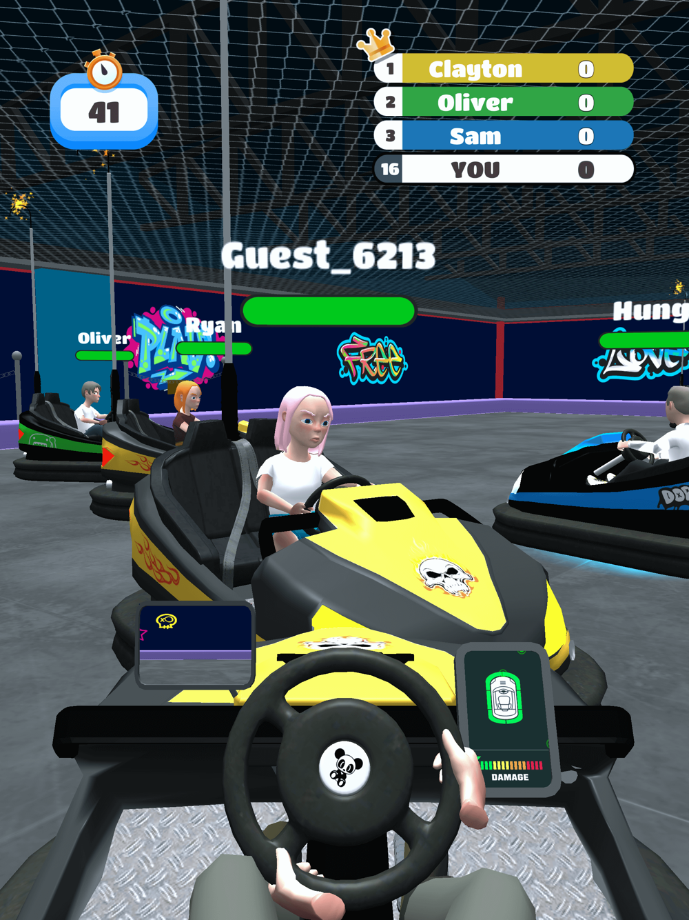 Let's have some fun! You can drive your bumper car and bump into the other players. You need to damage to others as much as you can and also run away from the other bumper cars!