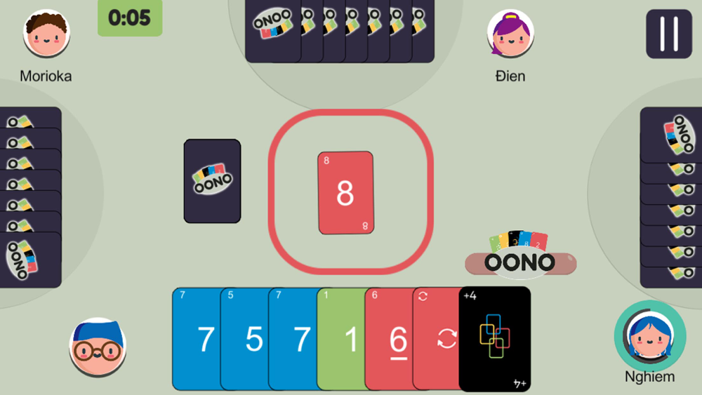 In Oono The card deck contains four colors with numbers from 0 to 9, as well as Action cards - "Reverse", "Skip", "Take Two", "Wild" and "Wild Take Four".