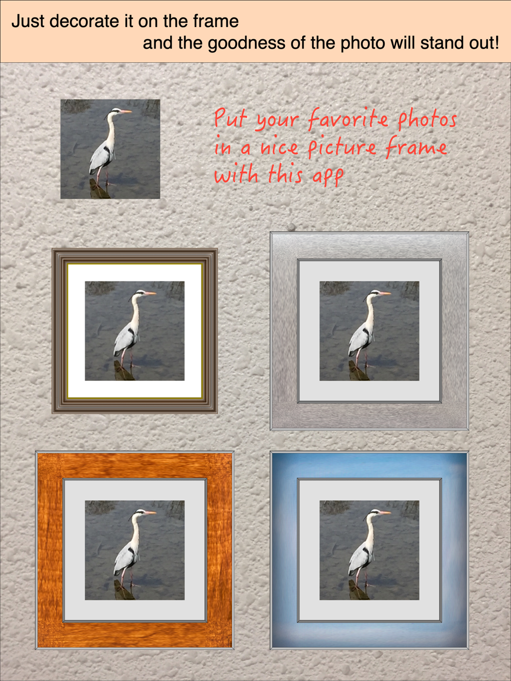 This app adds a picture frame to a photo file and outputs it as an image file.