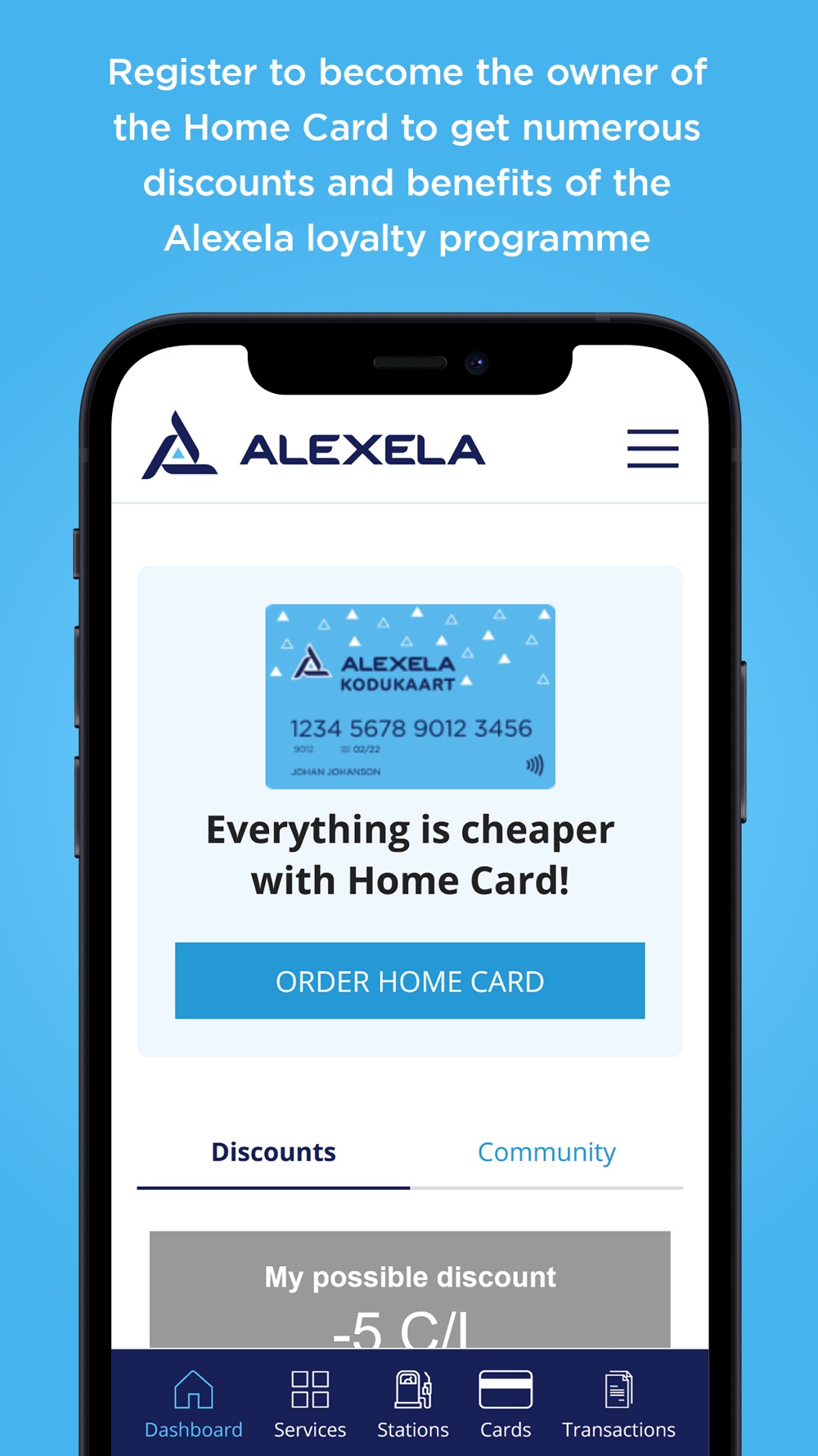 - Register to become the owner of the Home Card to get numerous discounts and benefits of the Alexela loyalty programme