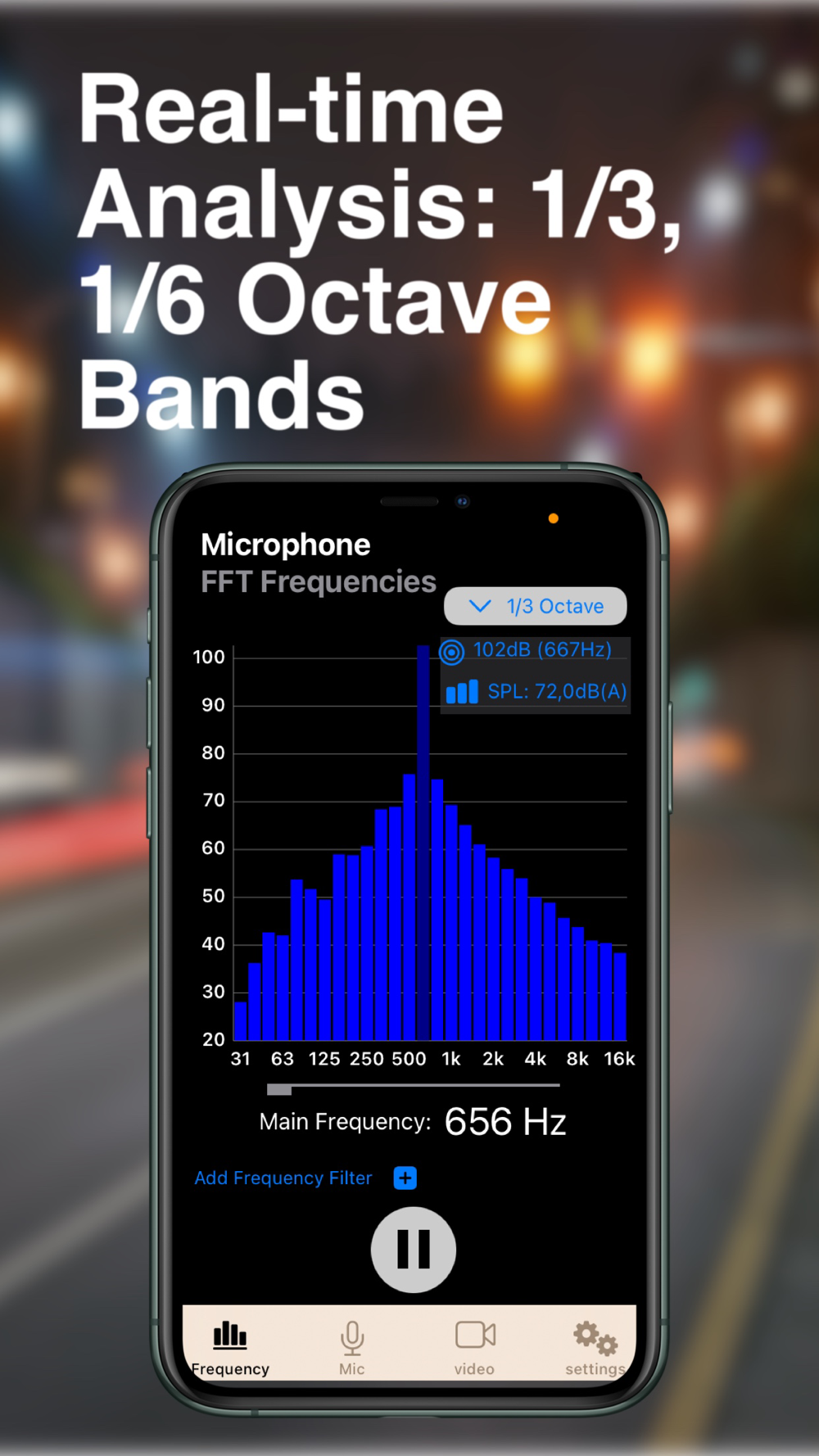 - Choose Octave, 1/3 Octave, 1/6 Octave for frequency analysis