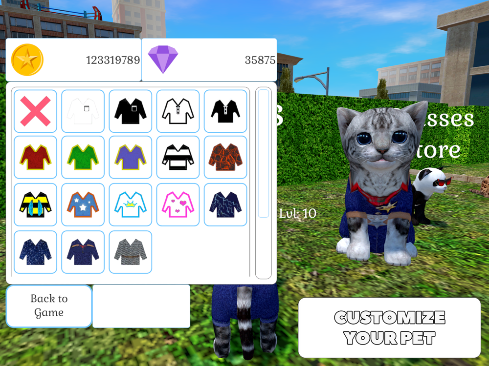 Visit Fashion Shop to give your kitten or puppy a special look. Buy collars for you cat or puppy, toys, costumes, hats, wings, trails, socks. Your pets will be very happy if you buy something for them. Visit Barbershop to change your pet's skin.