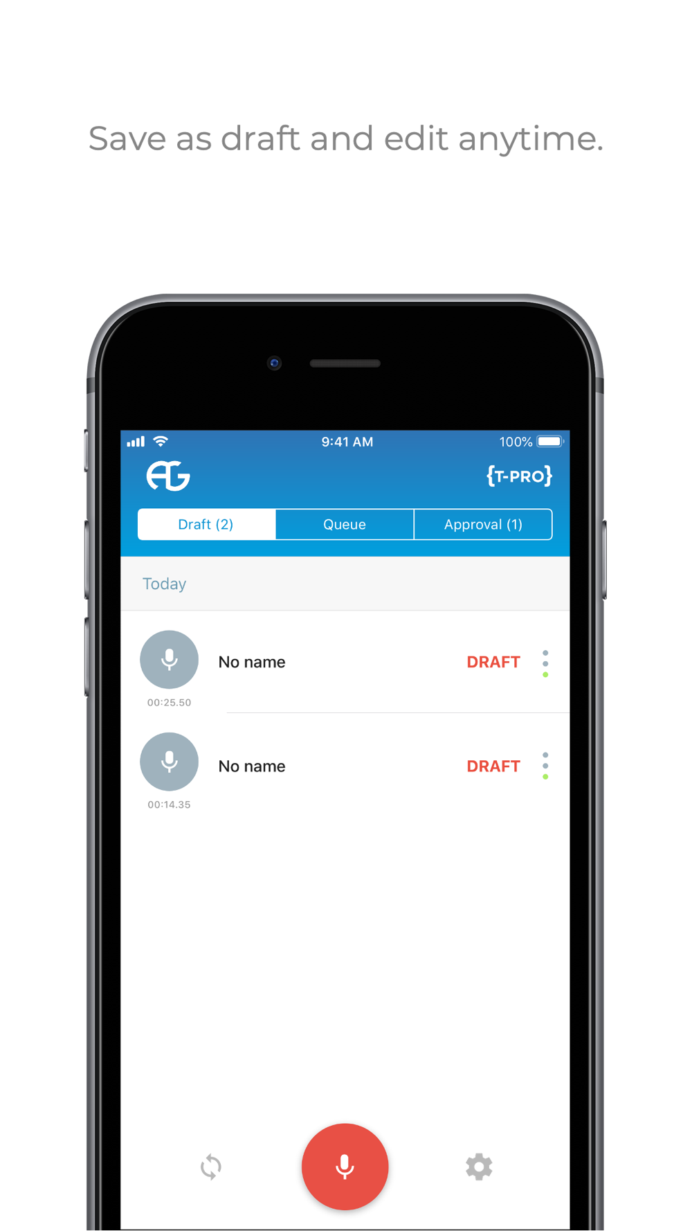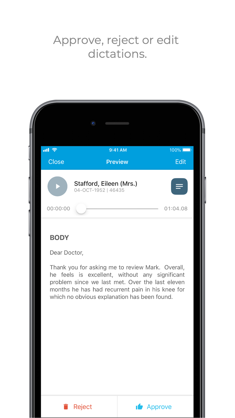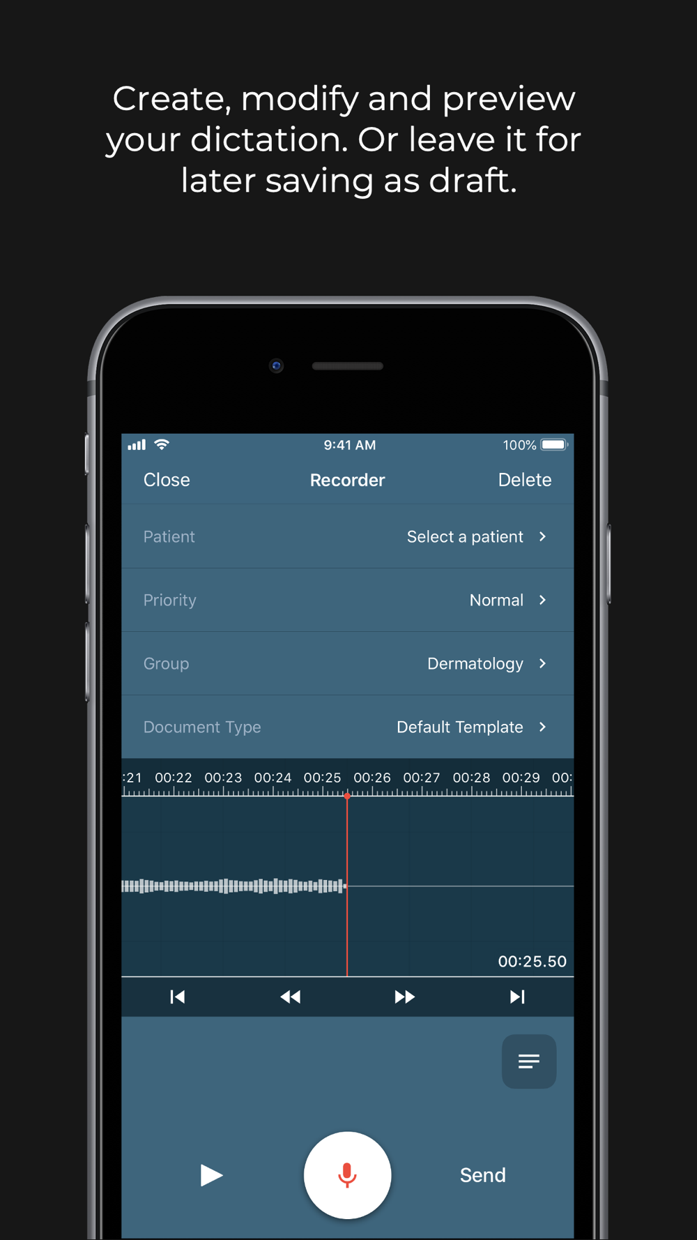 The Asdon Dictate app allows users to create dictations on the go, and securely send them the the Asdon Group platform for processing. Uploaded dictations can be tracked as they are processed by transcription teams or Asdon Group's back-end speech recognition servers.