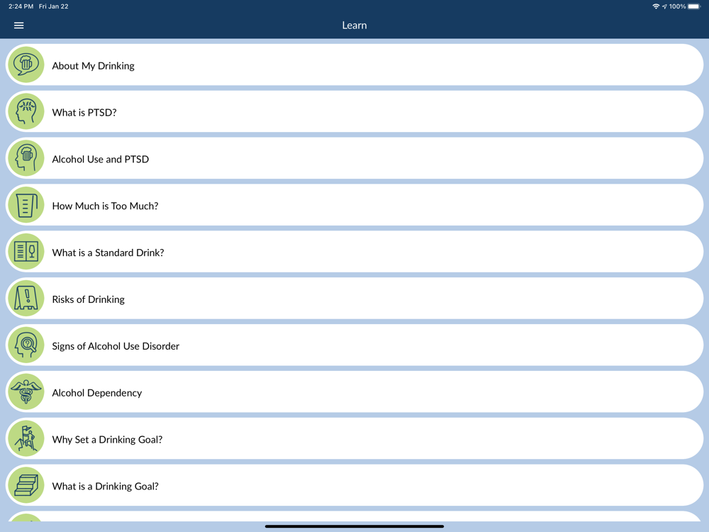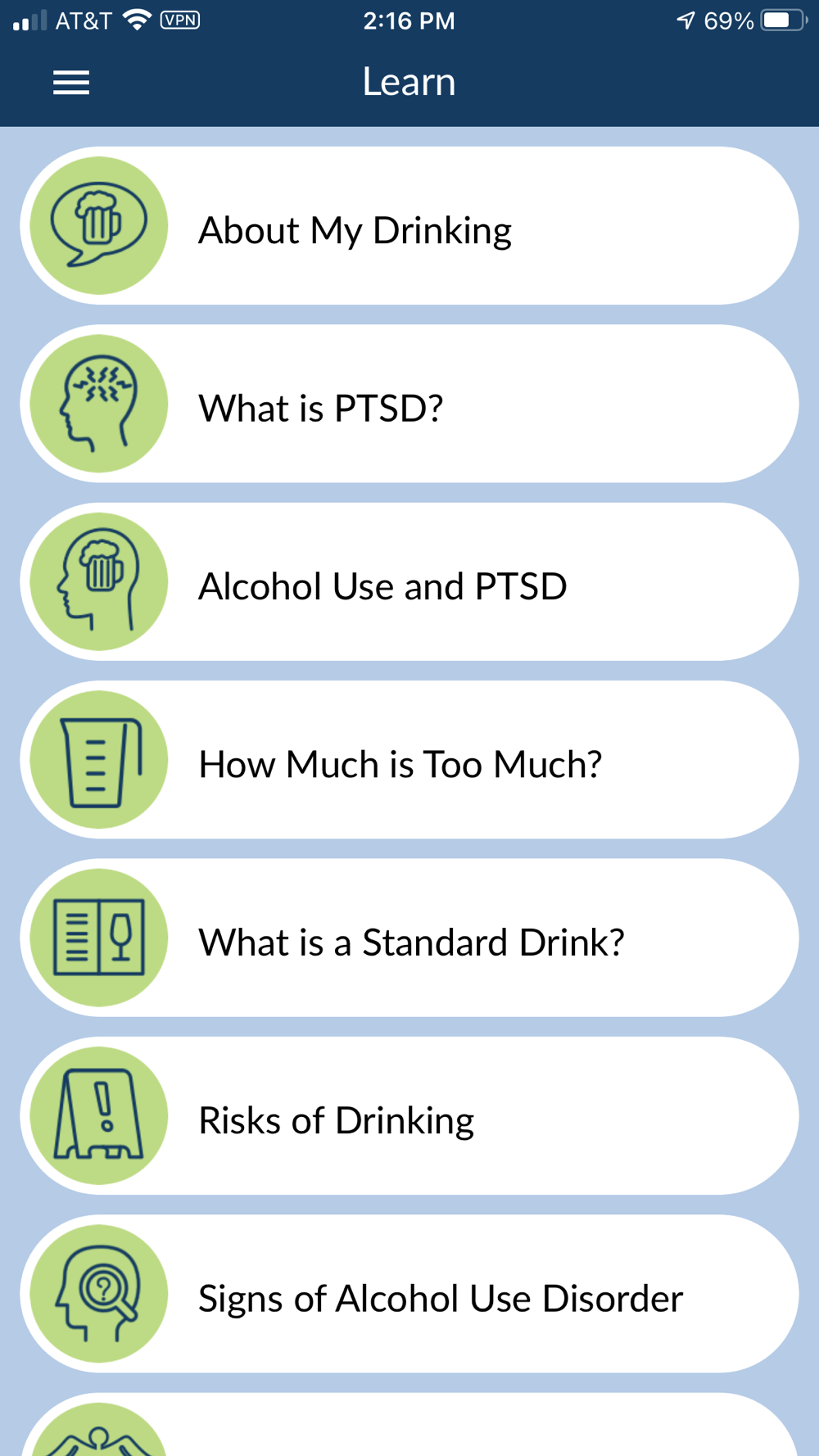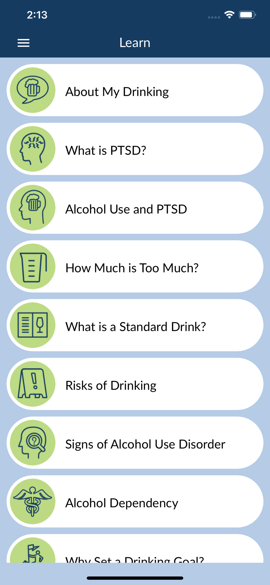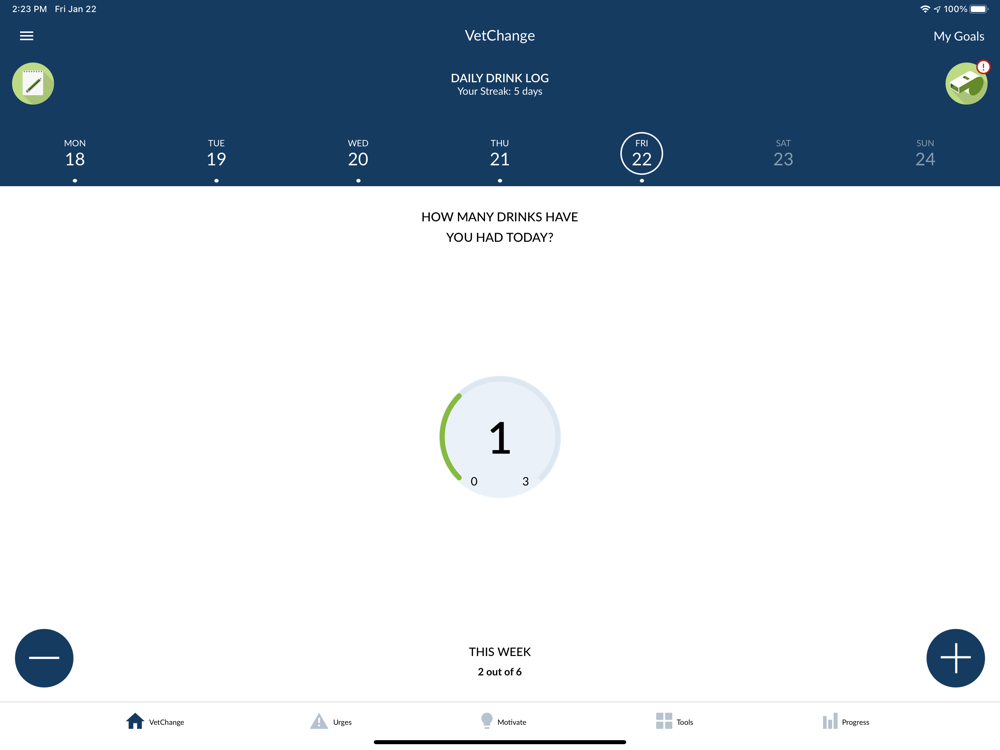 VetChange is an app designed for Veterans, Service members, and anybody who is concerned about their drinking and how it relates to stress. This app can be useful for developing healthier drinking behaviors. You can gain insight into how your drinking relates to different moods and situations, use interactive tools to manage your stress and urges to drink, learn about alcohol use and posttraumatic stress, and track your progress. The app also includes information about community resources and referrals to professional treatment.