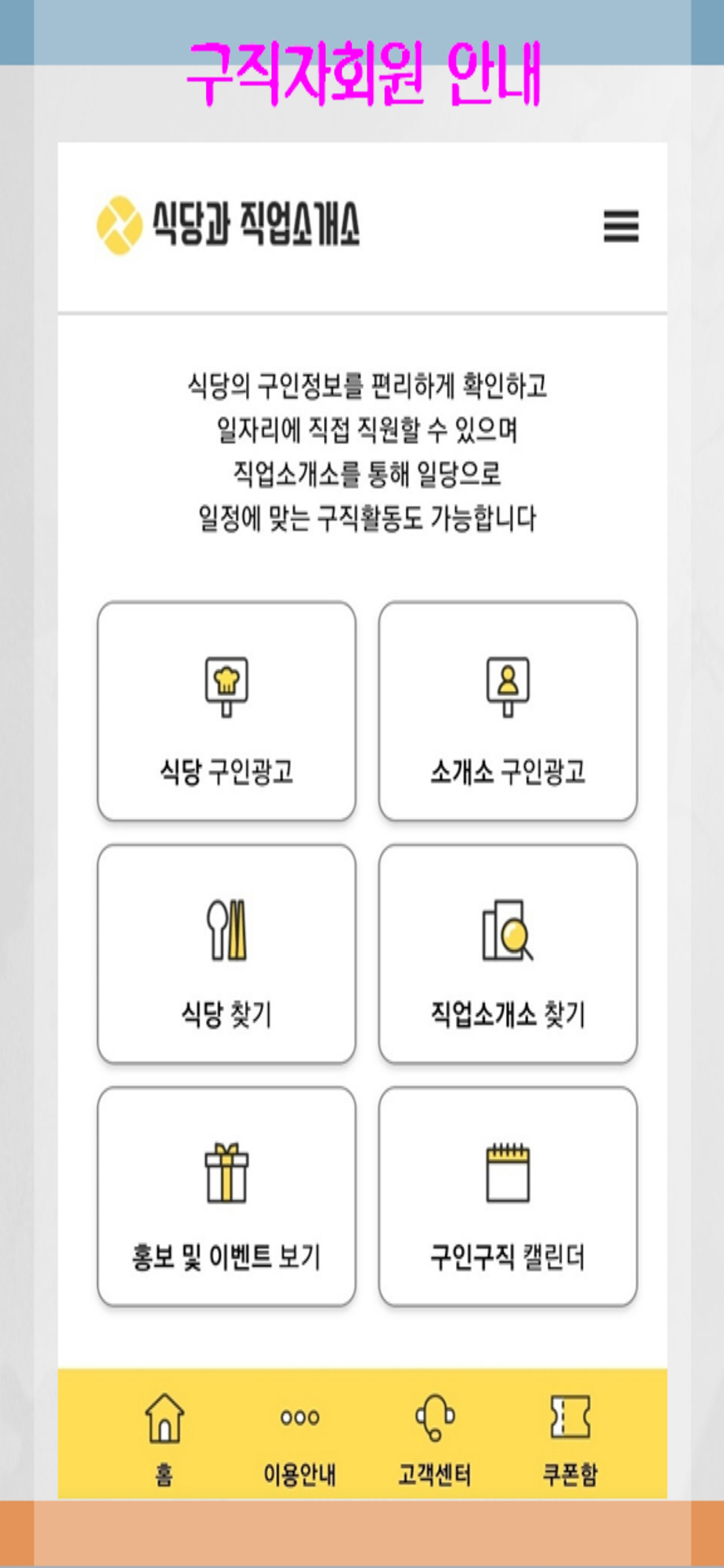 - 식당과 직업소개소 앱은 이용자의 위치를 기반으로 간편하게 모든 정보를 검색하고 활용할 수 있는 효용성, 누구나 간단한 조작으로 필요한 기능을 이행할 수 있는 편리성, 부담 없는 금액으로 구인기능과 홍보 기능을 이용할 수 있는 경제성, 식당에 특화된 홍보와 구인 기능에 중점을 둔 전문성, 회원의 니즈에 부응하여 서비스의 품질과 영역 확대가 가능한 확장성을 특징으로 하는 앱입니다.