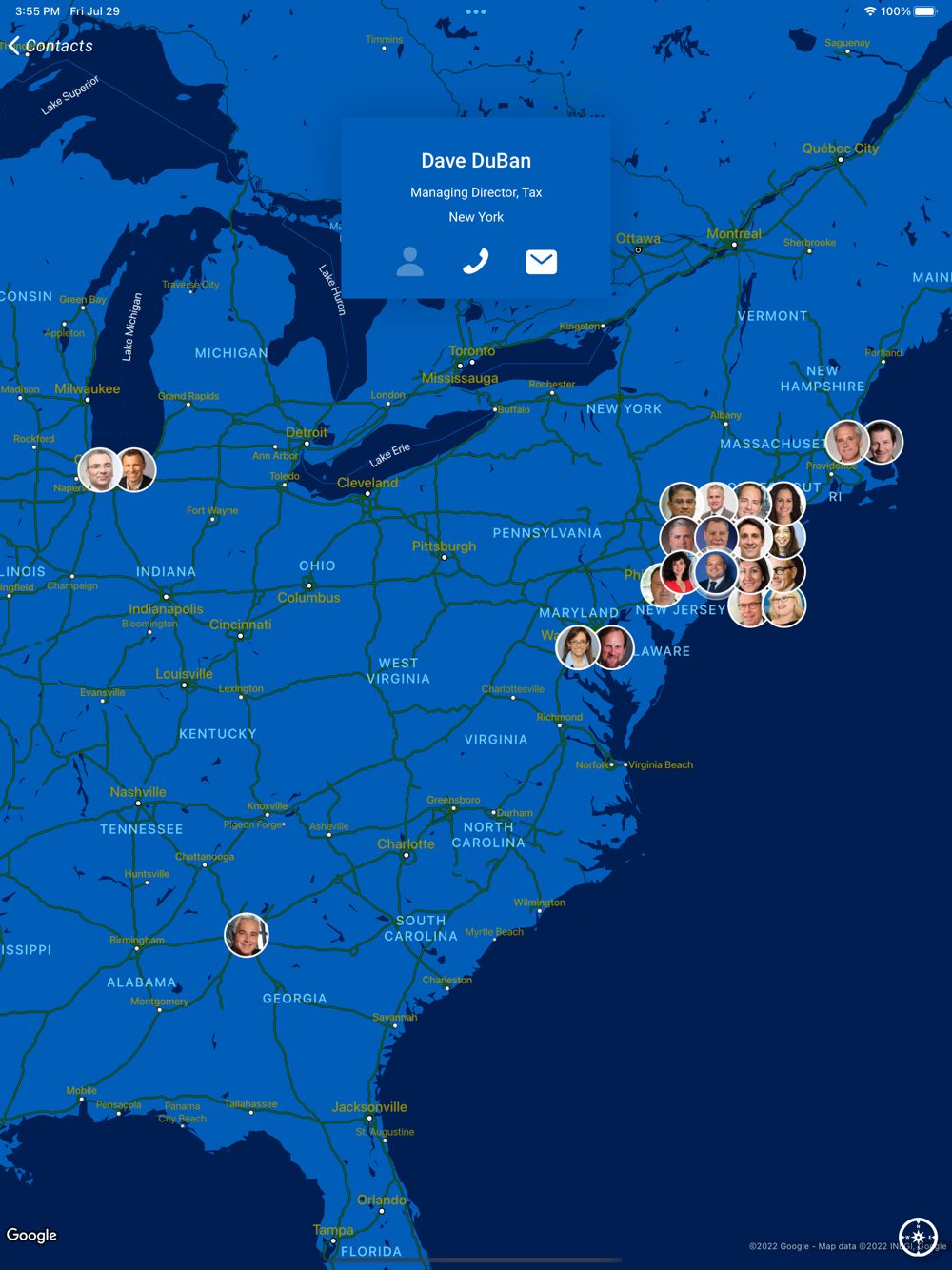 KPMG partner and engagement team contact information can be filtered by geographic jurisdiction or service line and viewed in a list or on a world map where contacts are displayed at their home offices. Contact biography, photo, email address and phone number are accessible from a tactile digital business card. Native dialer and default email launches automatically upon tapping phone or email icons, respectively.