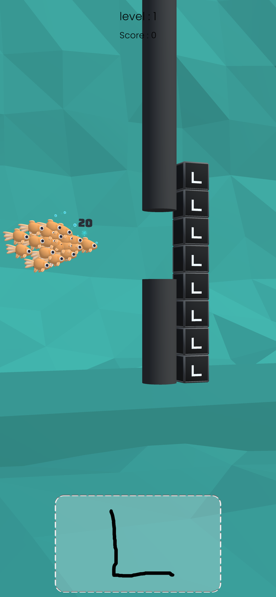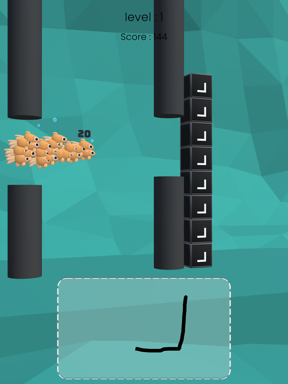 - Draw the shapes on the boxes to destroy them and make path to fishes.