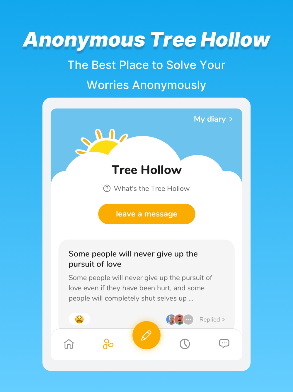 - Tree Hollow, In the old days, certain hollow trees were believed to have therapeutic powers, healing the sick and making people feel better. In this magical forrest hollow trees abound, where you can leave anonymous messages or respond to them anonymously, and be free to get whatever you need off your chest.