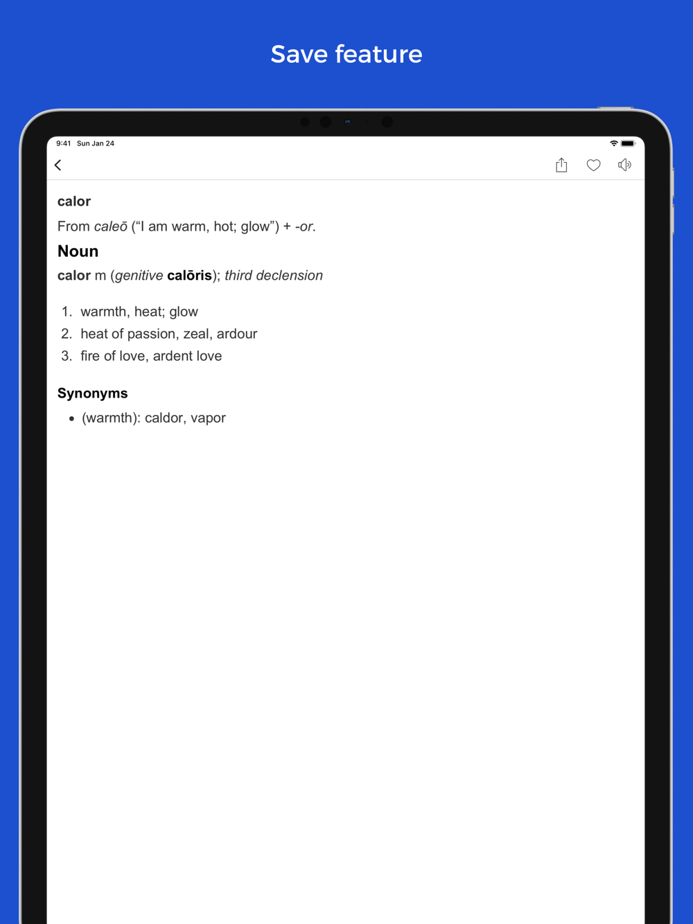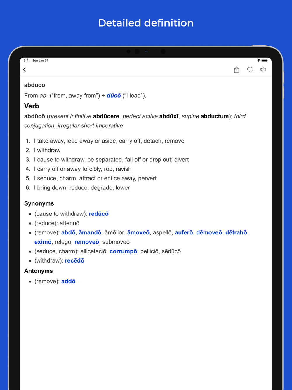 - Meaning, synonym, antonym, example sentences, etymology, etc.