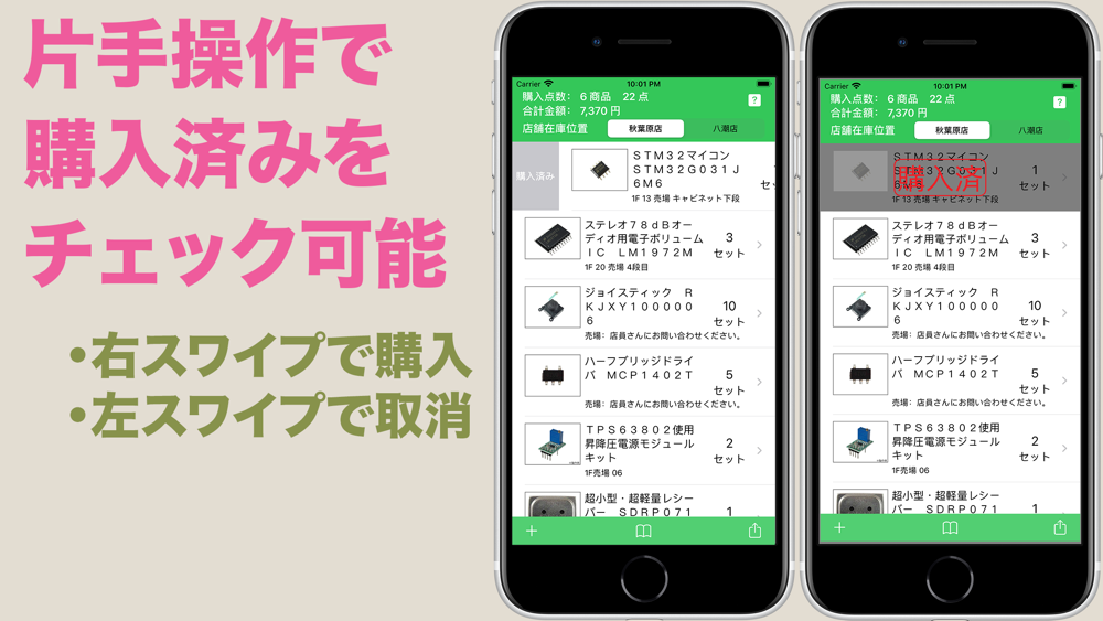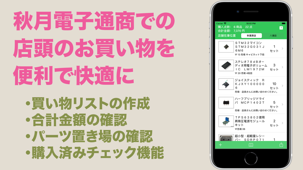 株式会社秋月電気通商でのお買い物を楽しく、便利にするアプリ「Parts Cart」です。