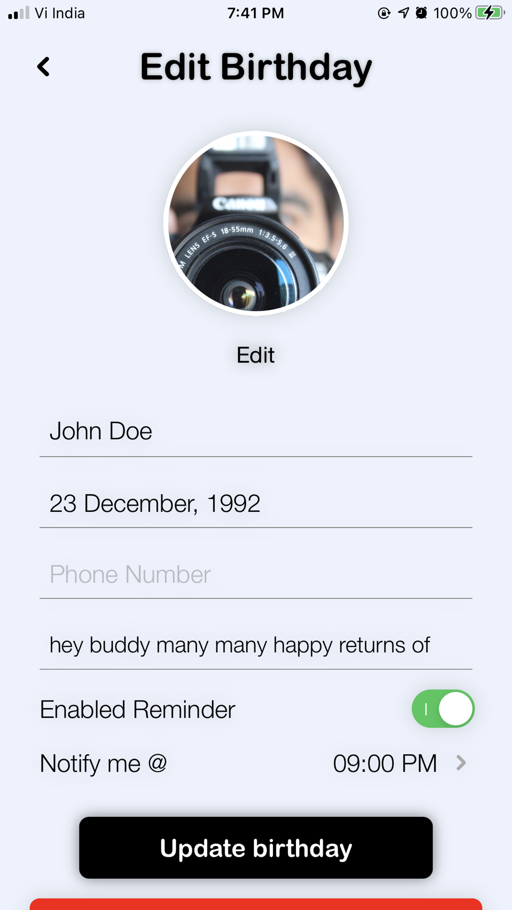 You just need to add your loved one name and birthdate on add birthday screen. Set notification on and that's it you will receive a notification as a reminder for the birthday just one day before at your convenient time which you select and never miss to be the first to wish them.