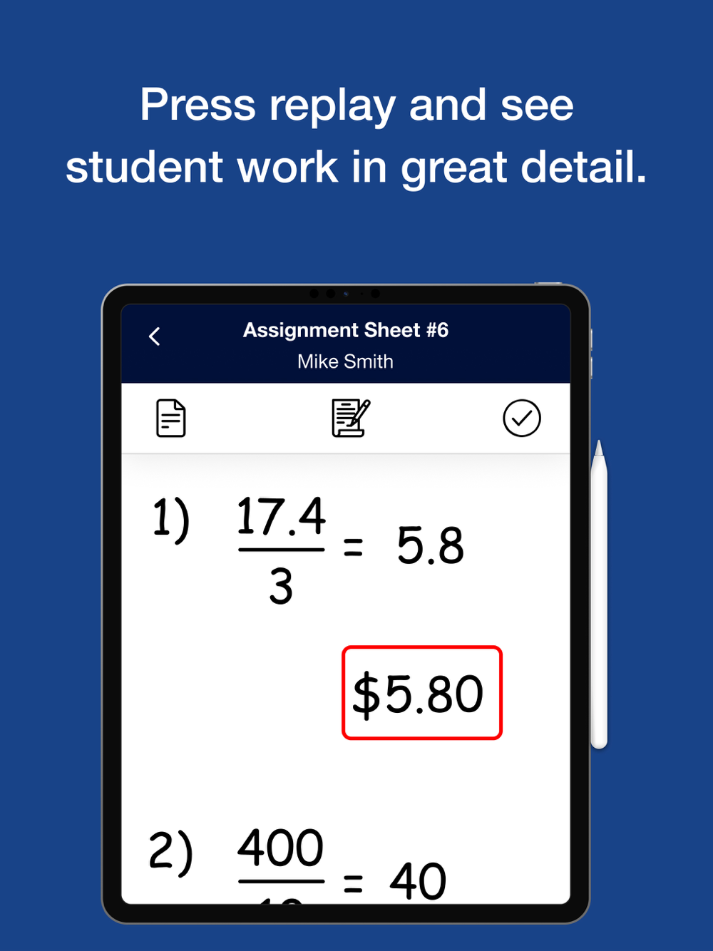 • Replay - Teachers are able to do and undo student work to see the order in which students wrote on the assignment, giving teachers a play-by-play of the process students used to complete each problem. Teachers can see students’ work from step 1 and students can see the exact process teachers used to correct their work and accurately complete each problem.