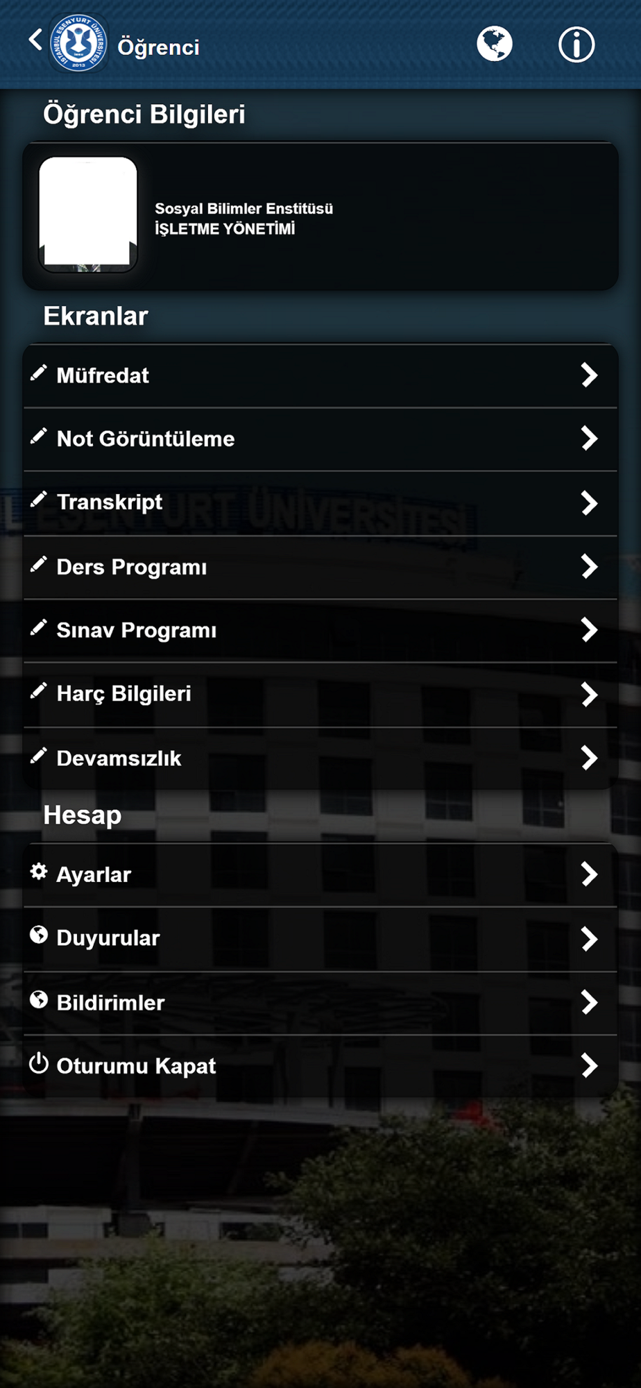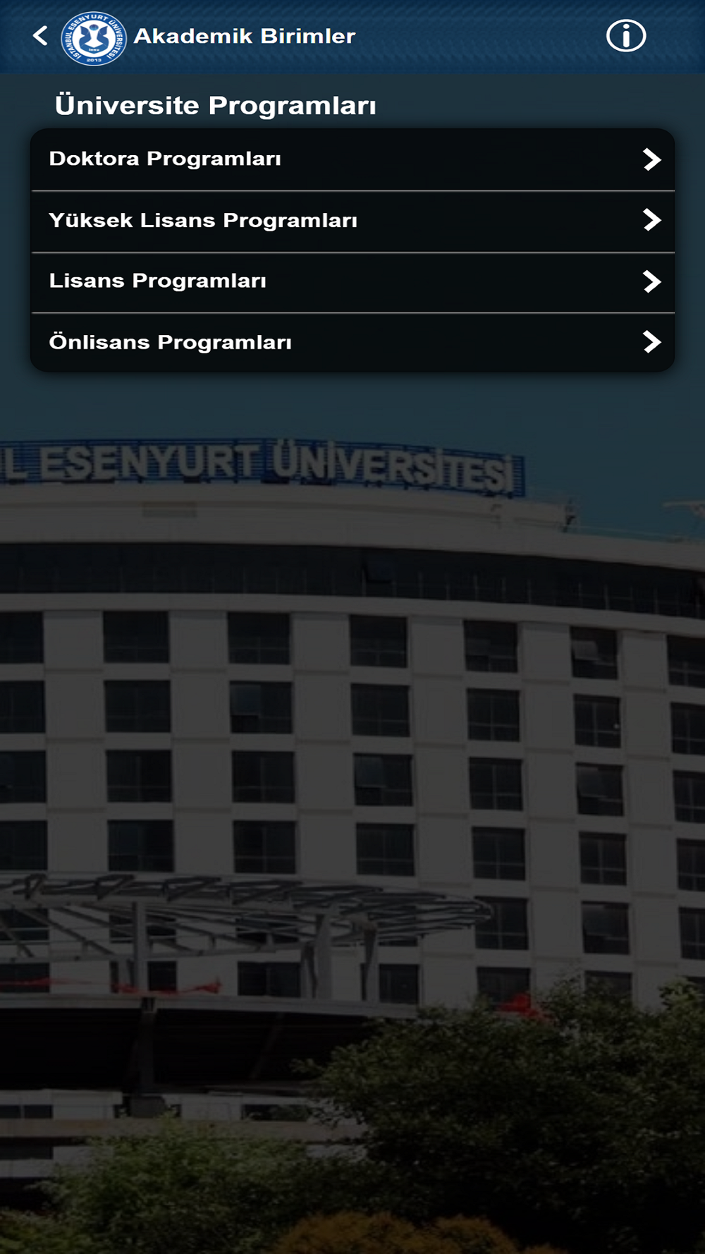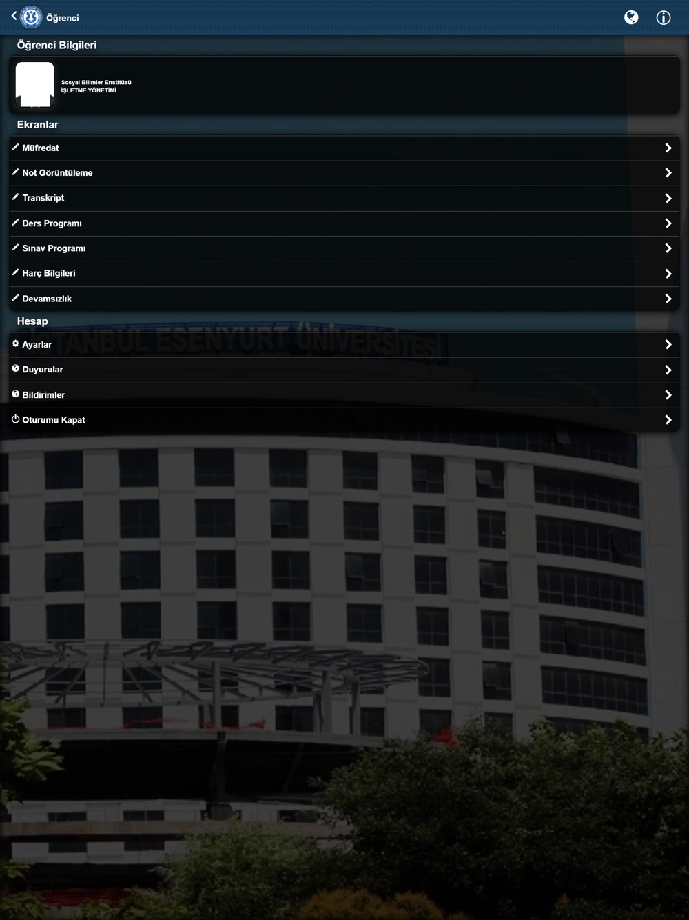 Bu uygulama İstanbul Esenyurt Üniversitesi mobil bilgi sistemidir. İstanbul Esenyurt Üniversitesi öğrenci, öğretim üyesi, yöneticiler ve genel kullanıcılar için hazırlanmıştır.