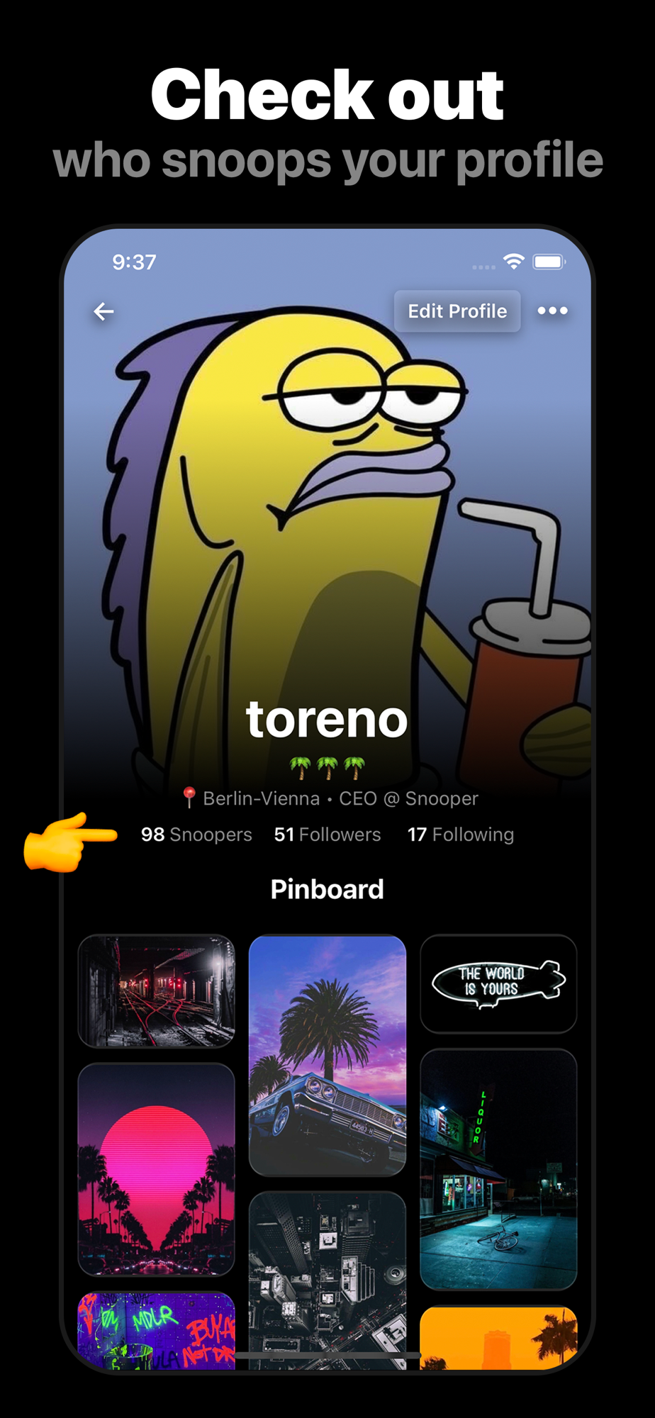 • Share others' posts with your followers by pinning them to your pinboard or externally to friends that are not on Snooper yet.
