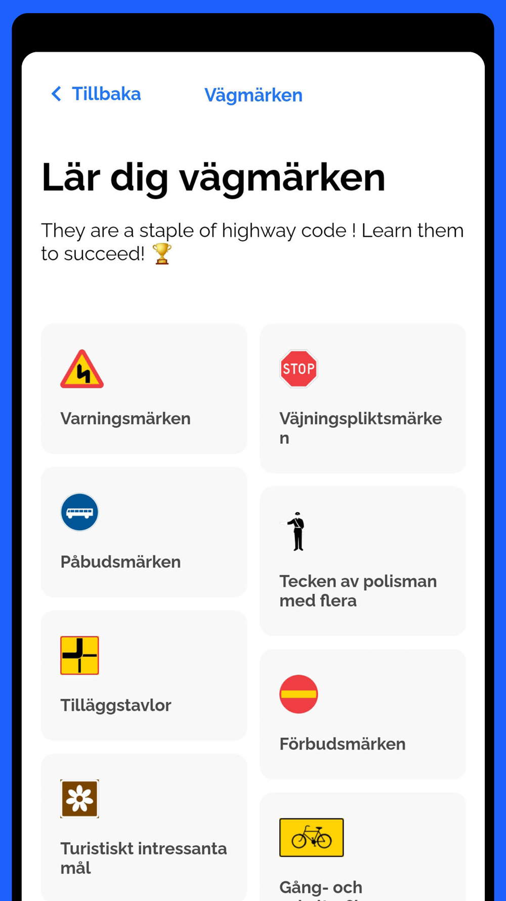 Lär dig samtliga trafikmärken snabbt och enkelt. Med vår app blir det till och med roligt att plugga till ditt körkortsprov.