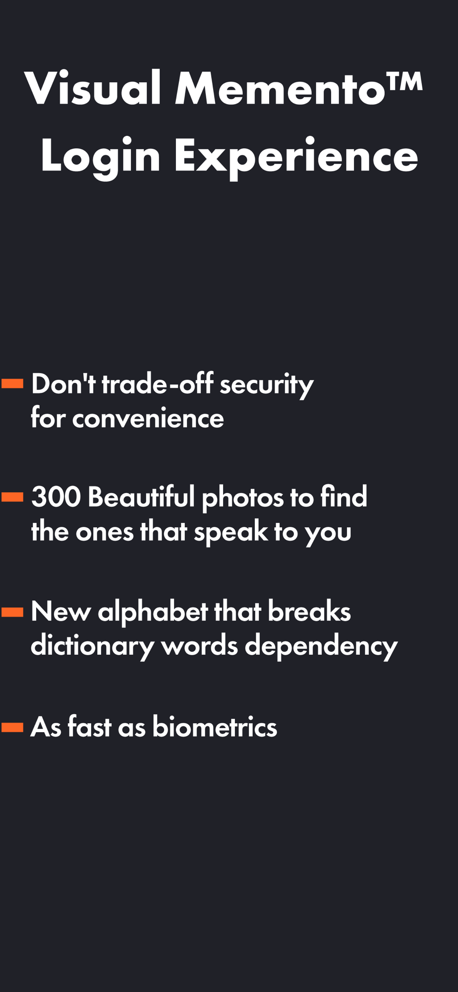 GhostKey™ was designed to disappear. We’ve reduced the number of touches to the bare minimum, speeding up your login experience. Instead of inventing passwords, you use existing memories, which we call Flashbacks and Mementos. A Flashback is entered once per device, while a memento is entered every time you log in. Using a Visual Memento renders the login experience as fast as using biometrics.