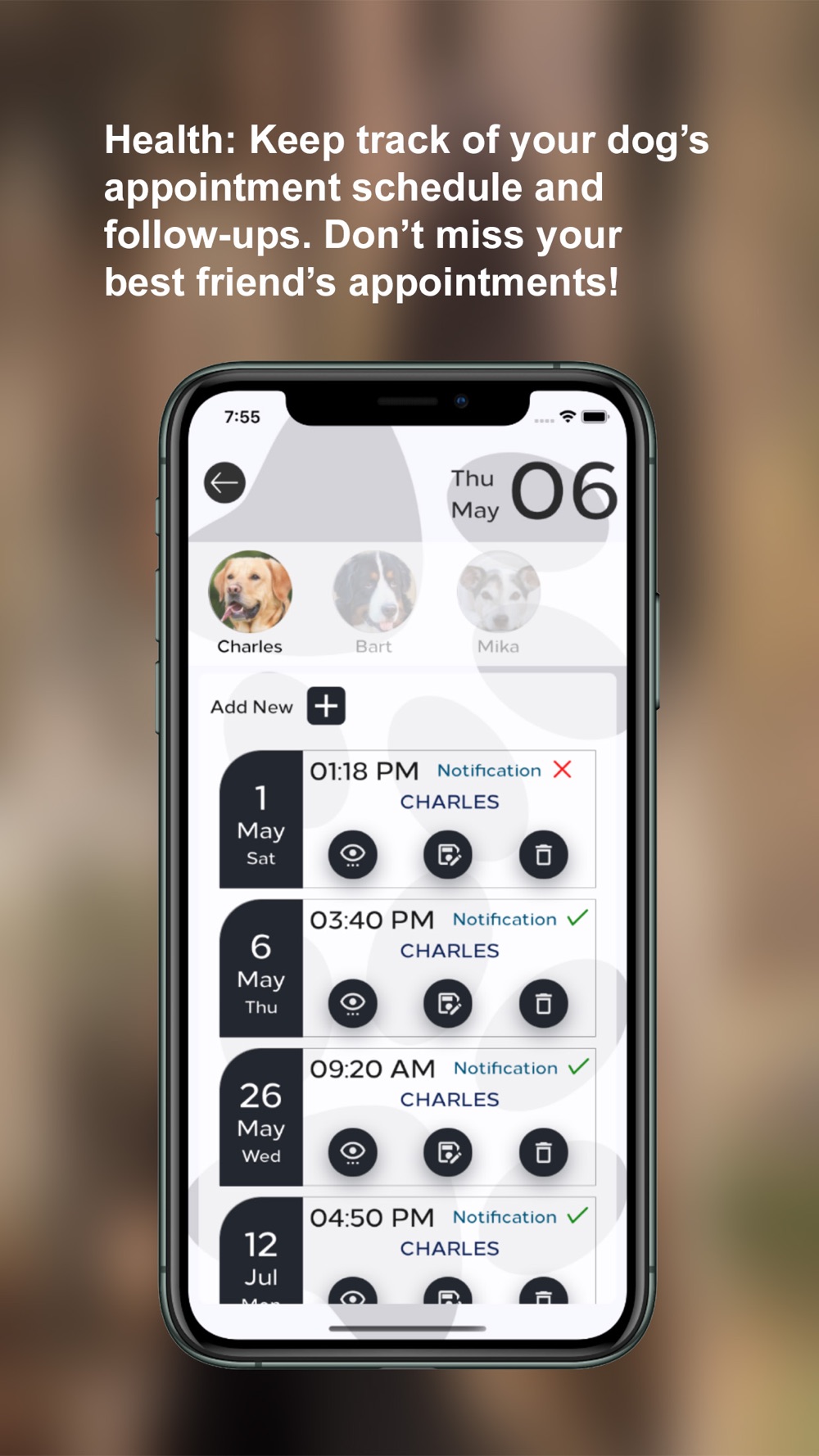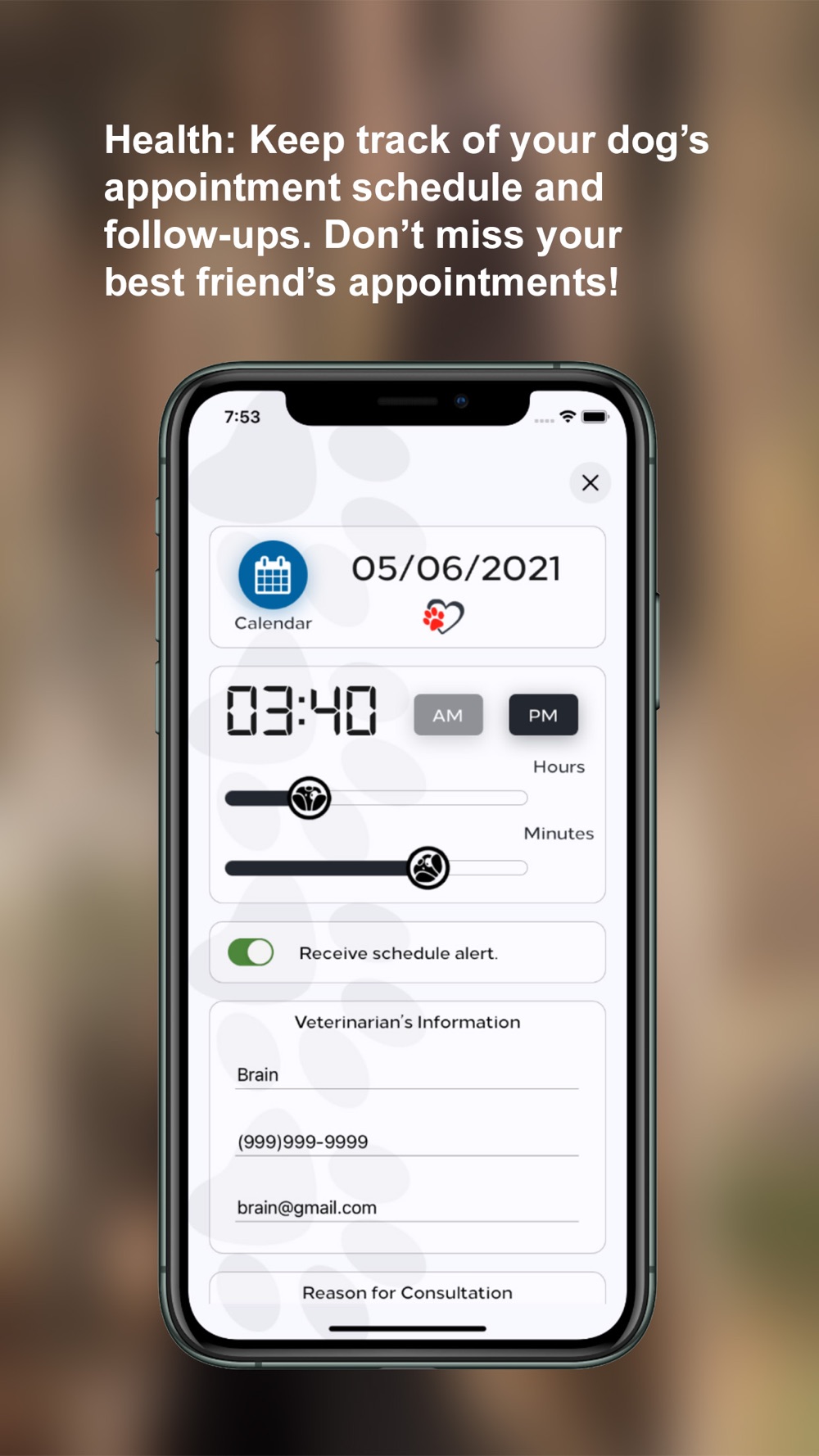 - Health: Keep track of your dog’s appointment schedule and follow-ups. Don’t miss your best friend’s appointments!