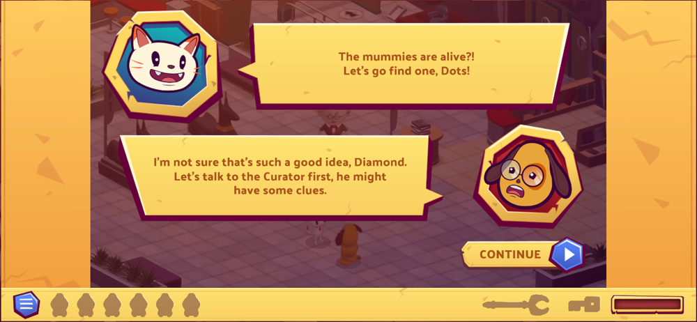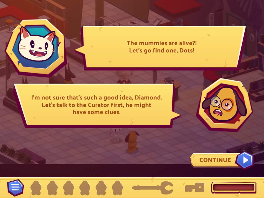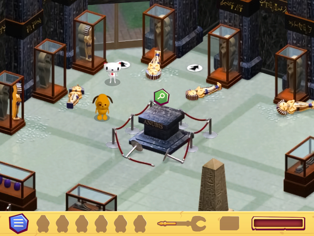 Choose to play as Dots or Diamond and solve the mysterious case of the missing mummies by finding the Curator’s lost key and uncovering Scarab Jewels that have disappeared throughout the Museum… all before the exhibitions grand opening.