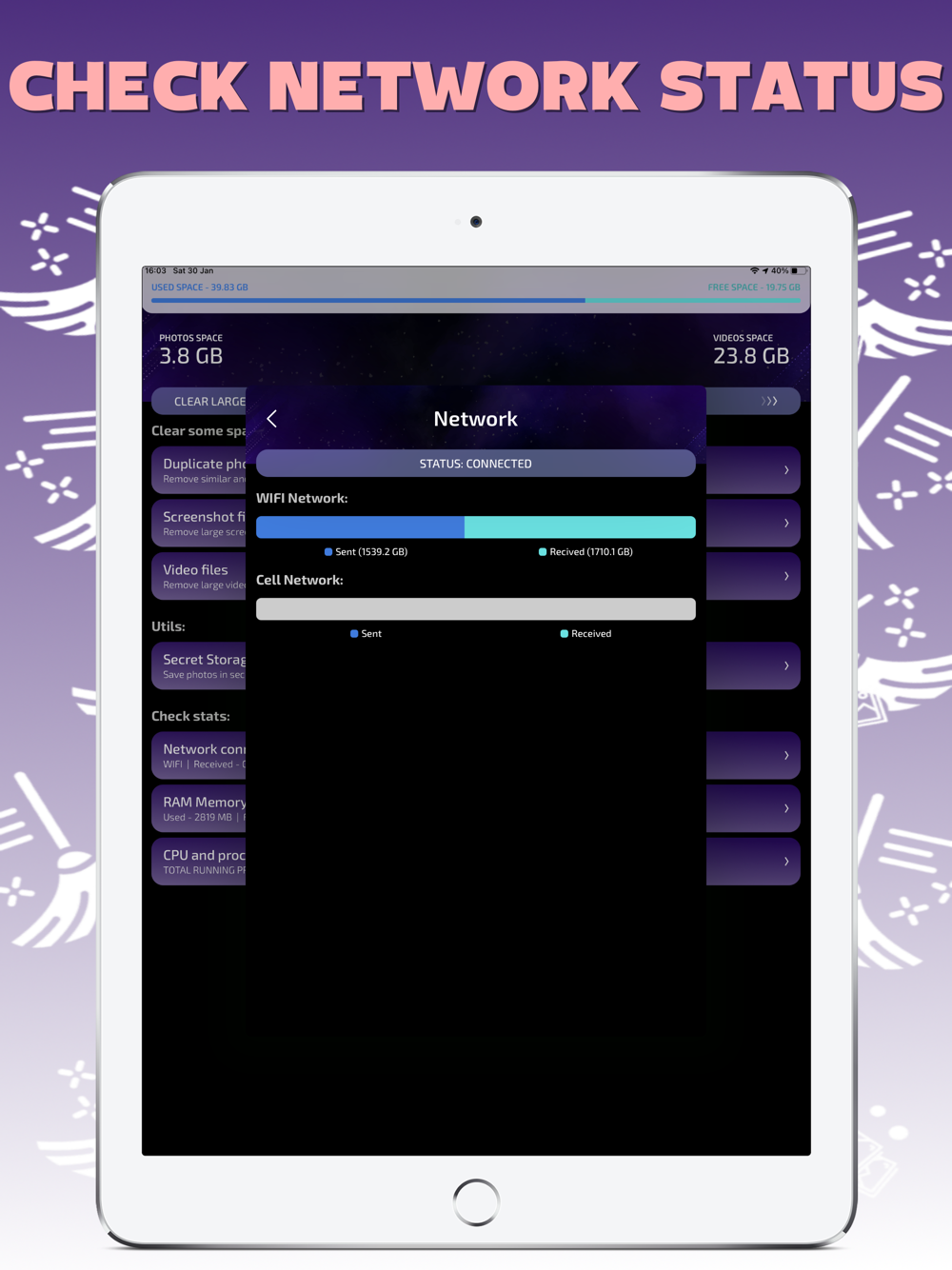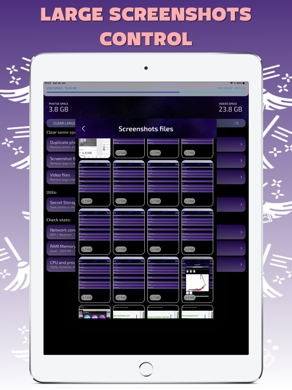 With this app you can easily remove screenshots, dublicated pictures, large videos and photos. Keep safe your personal media in secret folder, check your network connection, RAM and CPU.