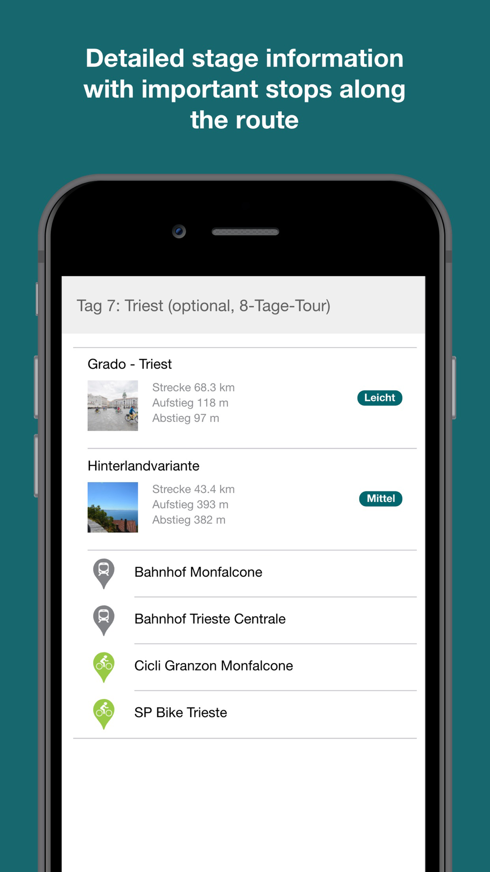For every single day, you have all the relevant information on your smartphone: constantly checked and updated GPS data, places to stop for refreshments, sights and cycle service points along the route, the booked accommodations and automatic route guidance from the end point of the stage to there with the help of Google Maps, information on transfers and required tickets on the respective stage.