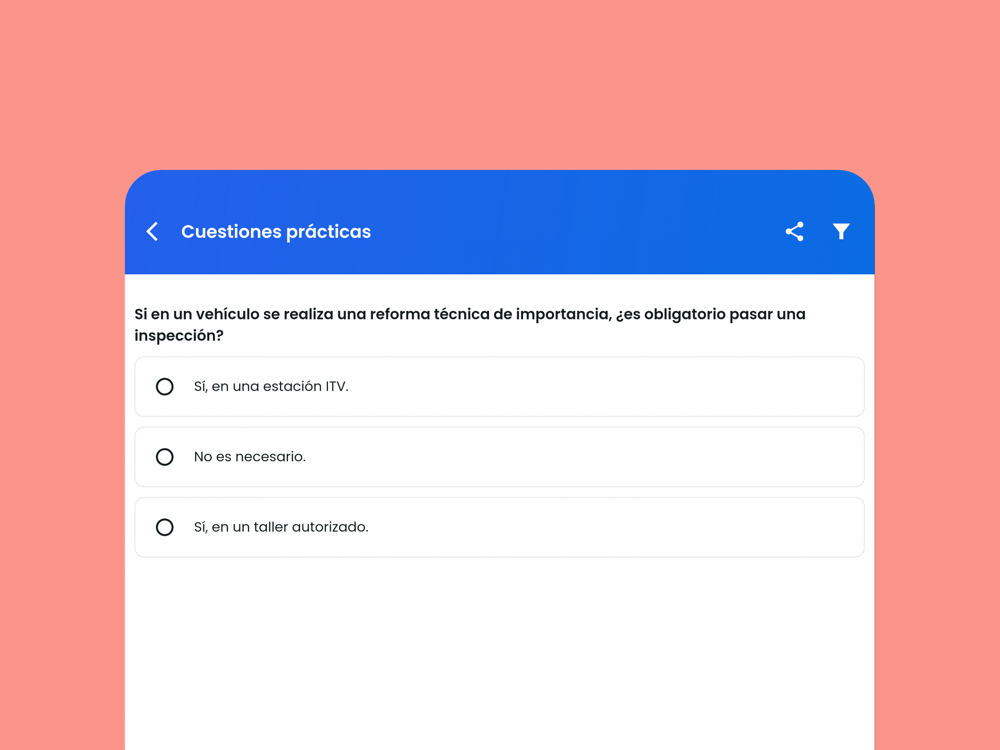 1) Preguntas de práctica: si se te suele olvidar con facilidad lo que aprendes, nuestra app te hará preguntas aleatorias de cualquier módulo del temario oficial de 2021, para que así practiques y no se te vuelvan a olvidar cuando estés delante del Test DGT.