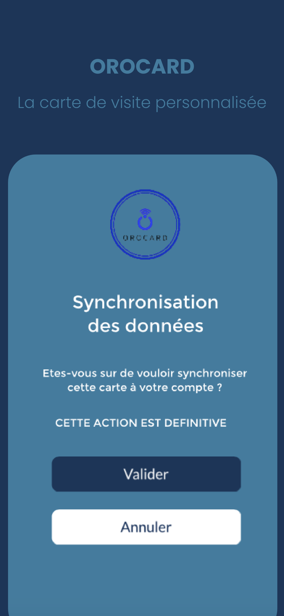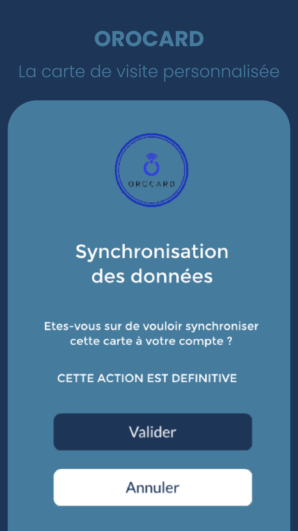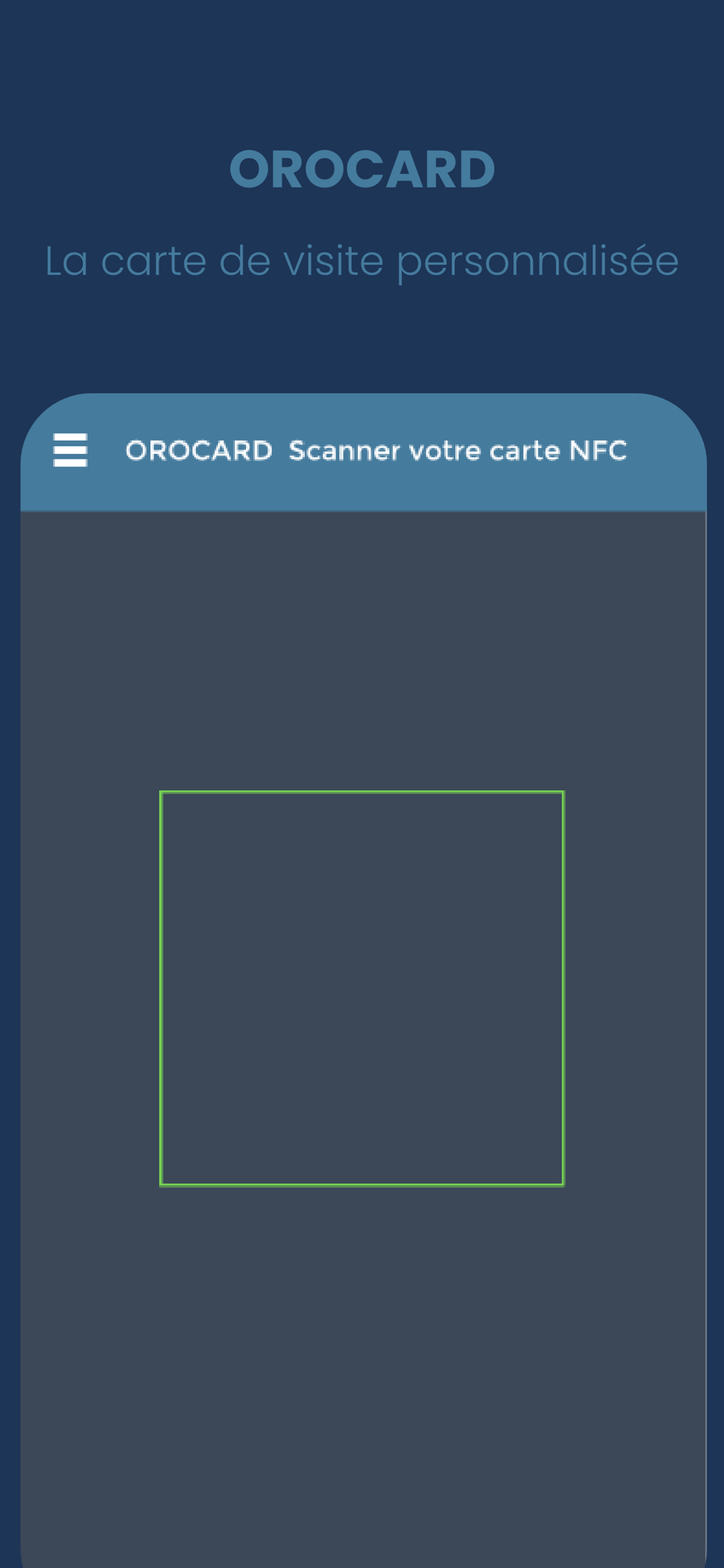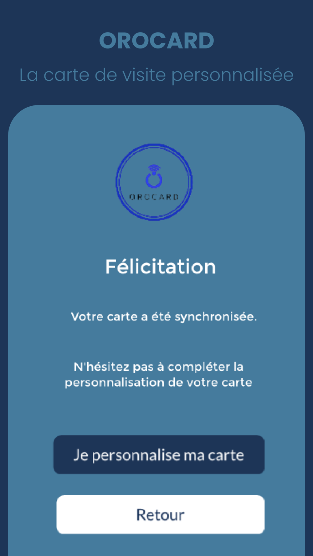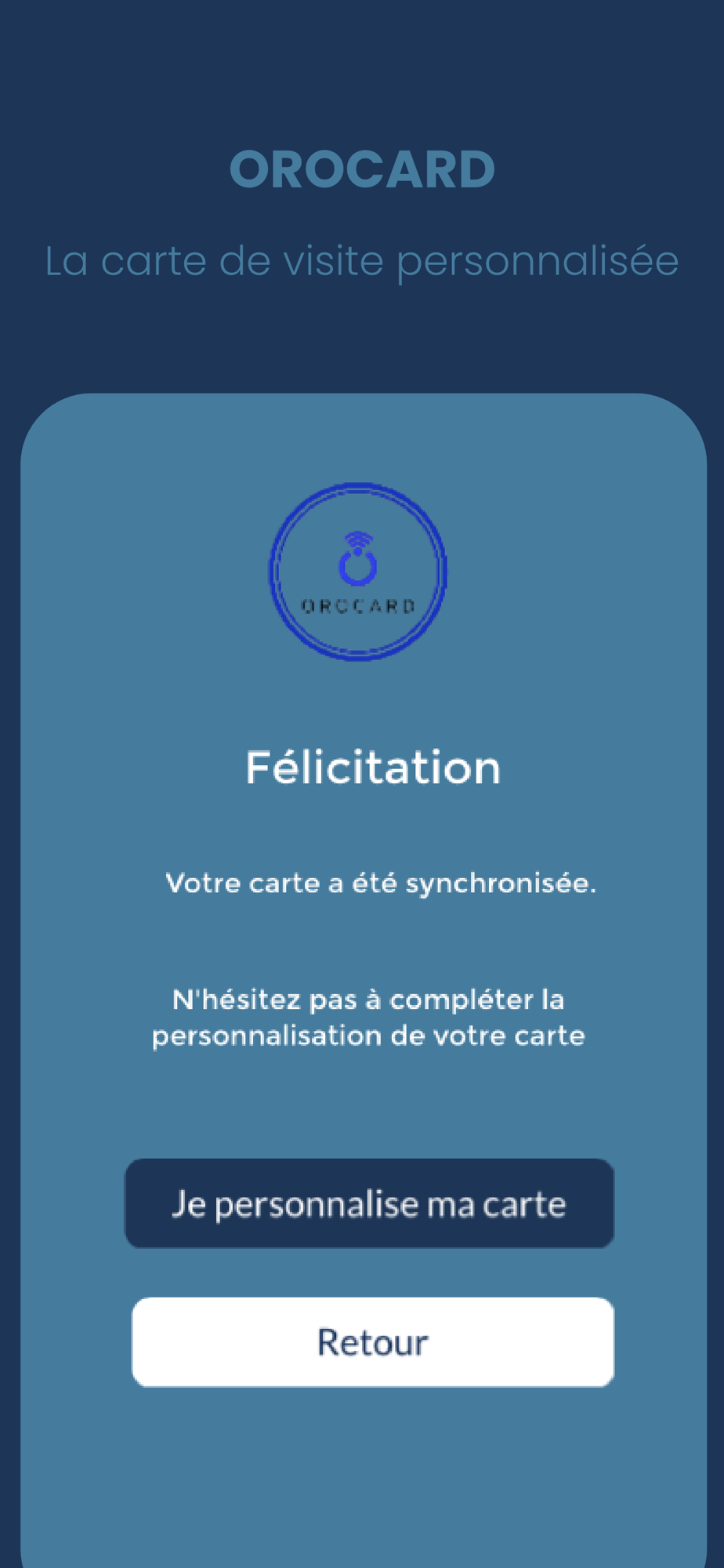 Après avoir configurée votre page sur notre site Internet: https://orocard.fr/ connectez-vous sur l’application avec votre identifiant et mot de passe pour configurer votre carte. Une fois votre carte synchronisée, partager votre carte de visite grâce à votre carte intégrant la technologie NFC.