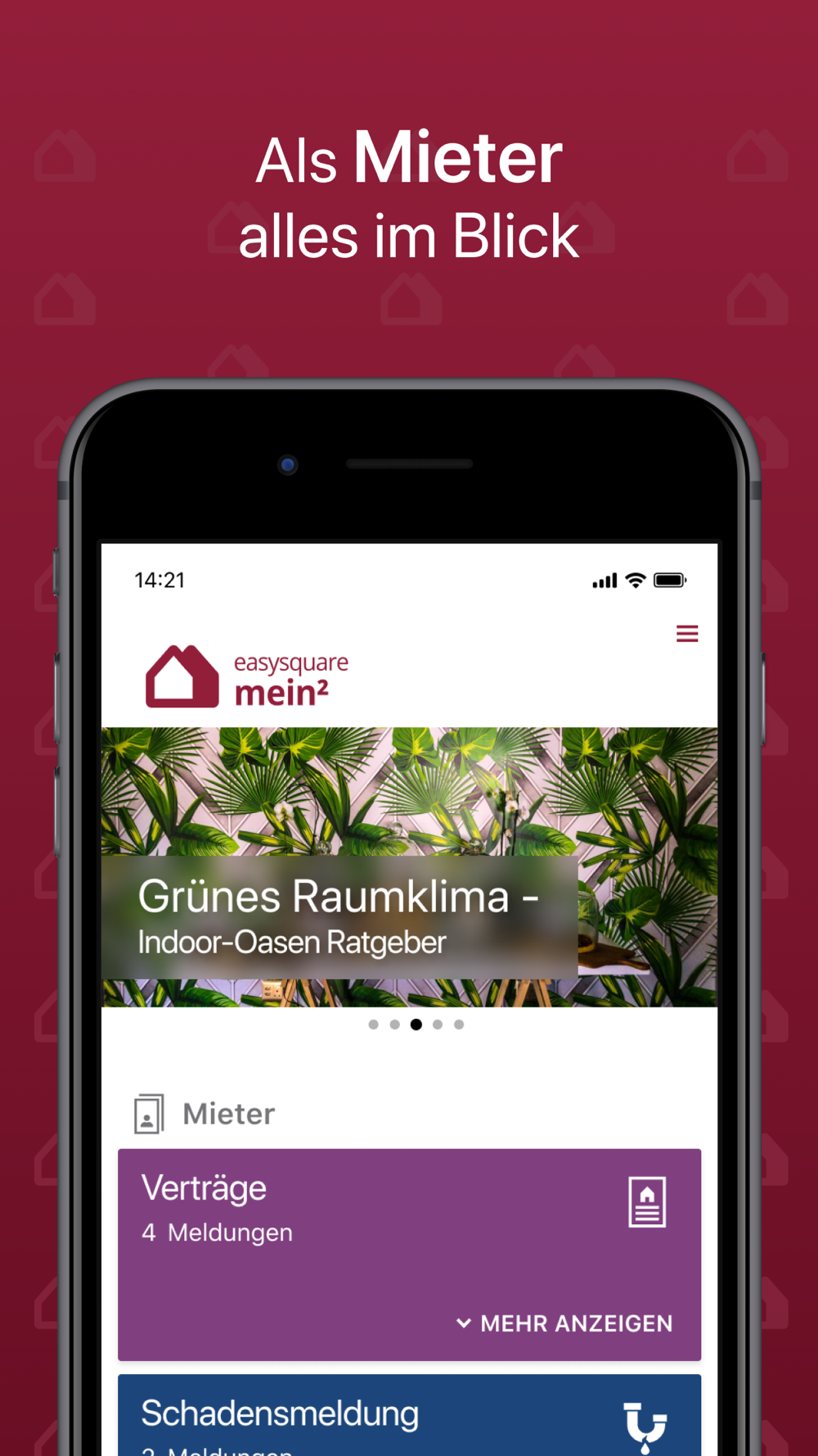 mein² – Die App für Ihre Kunden in der Immobilienwirtschaft 2.0. Digitalisieren Sie nicht nur Ihren Arbeitsalltag mit der Verwalter-App, sondern auch die Kommunikation mit Ihren Kunden. Ob Interessent, Mieter oder Eigentümer – mit mein² erreichen Sie alle mit einer App. Von der Schadensmeldung über die Serviceanfrage bis zu den Vertragsdokumenten – standardisieren Sie einfach und digital Ihre Kommunikationswege. Neben dem Kontakt zum Wohnungs- oder WEG-Verwalter können sich Kunden ebenso in ihrer Nachbarschaft vernetzen und so die Gemeinschaft im Quartier stärken!