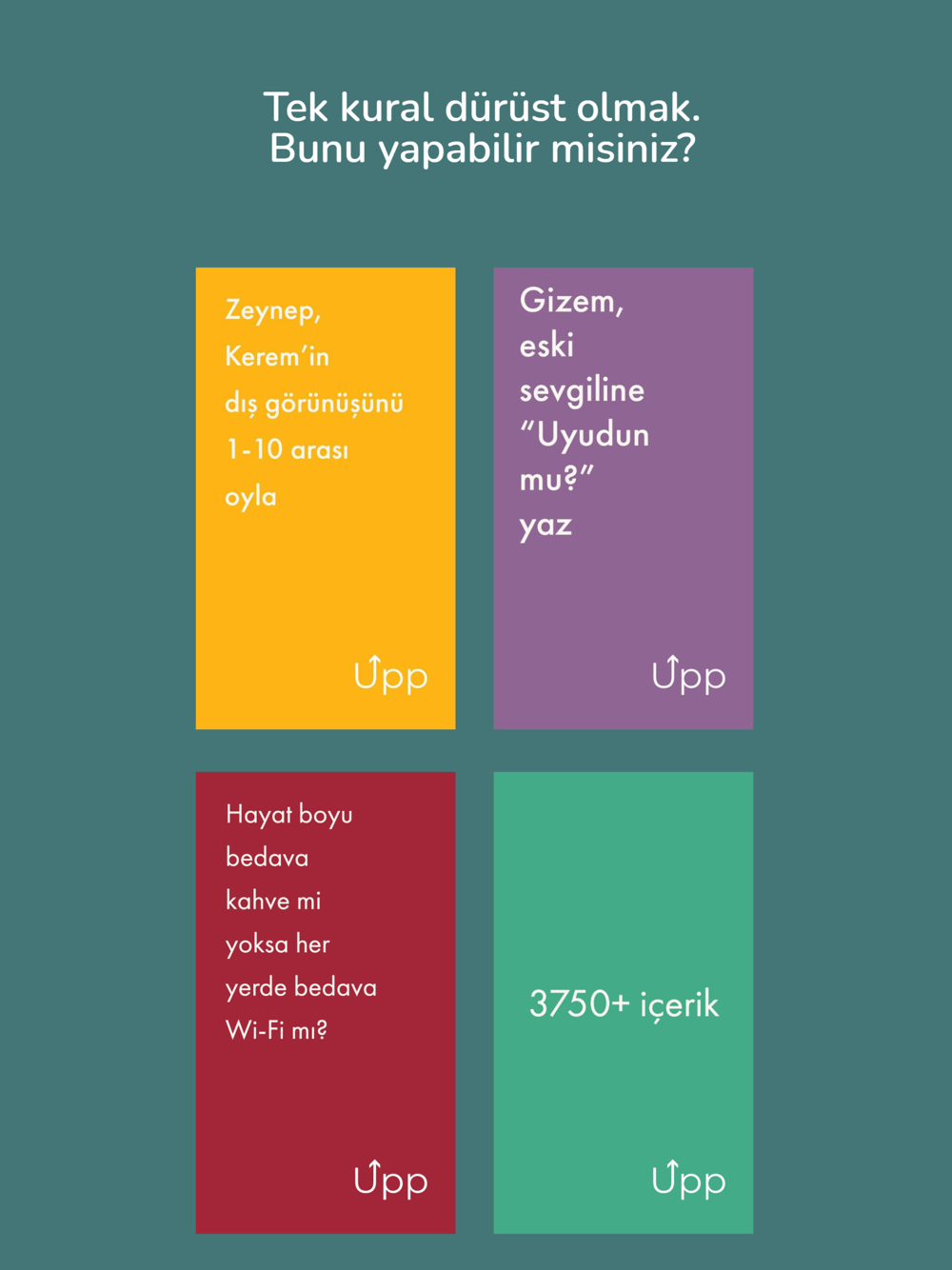 Şişe Çevirmece, Doğruluk mu Cesaret mi, Abdi gibi bildiğiniz tüm klasik parti oyunlarının yanı sıra Bug, Dilemma gibi orijinal Upp oyunlarını, ve çok daha fazlasını sizler için bir araya topladık. Yeni sorular üretemediğiniz, muhabbetin tıkandığı durumlarda Upp en büyük yardımcınız.