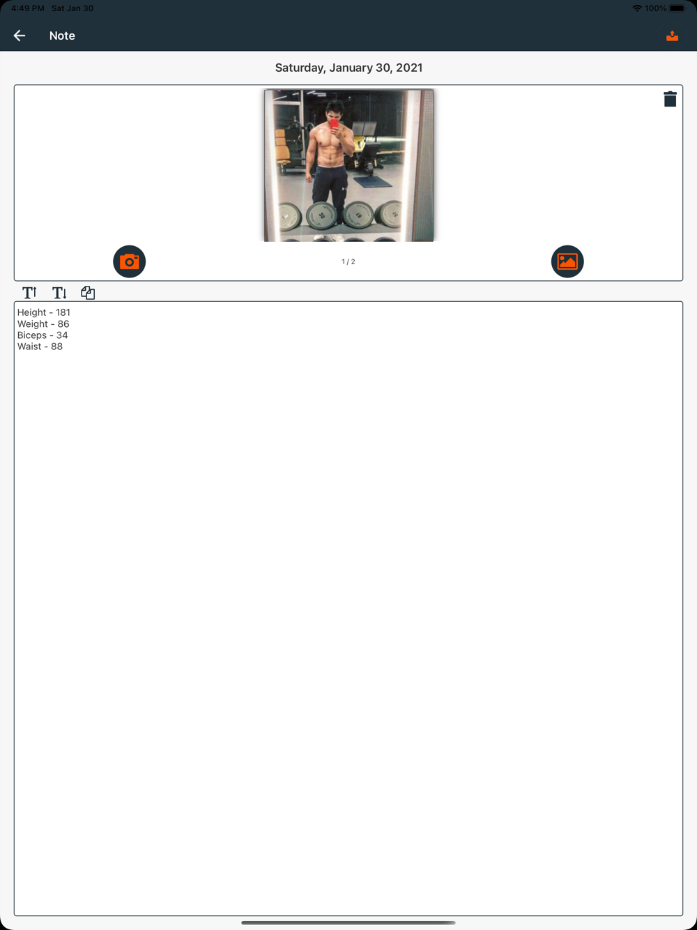 - Save important daily details (weights, height, waist, chest, biceps size, etc)