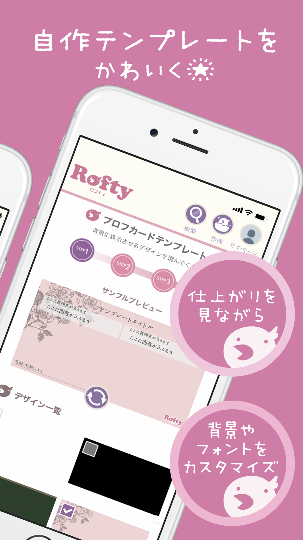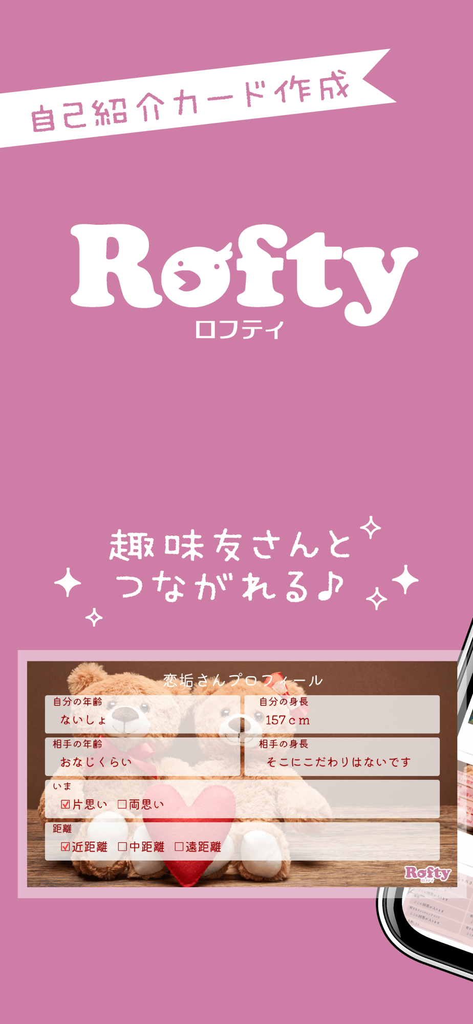 小学校で大流行した懐かしの「プロフ帳」が登場しました!Rofty(ロフティ)はプロフカードの作成ができるオンラインプロフィール帳です。質問に答えてプロフカードを作成できたり、友達が作ったカードを見たりできます。プロフカードを書いて友達に回すときのドキドキはそのままに、カスタマイズ自由で可愛いデザイン満載のRoftyをお楽しみください。