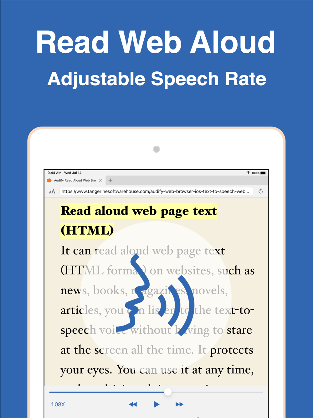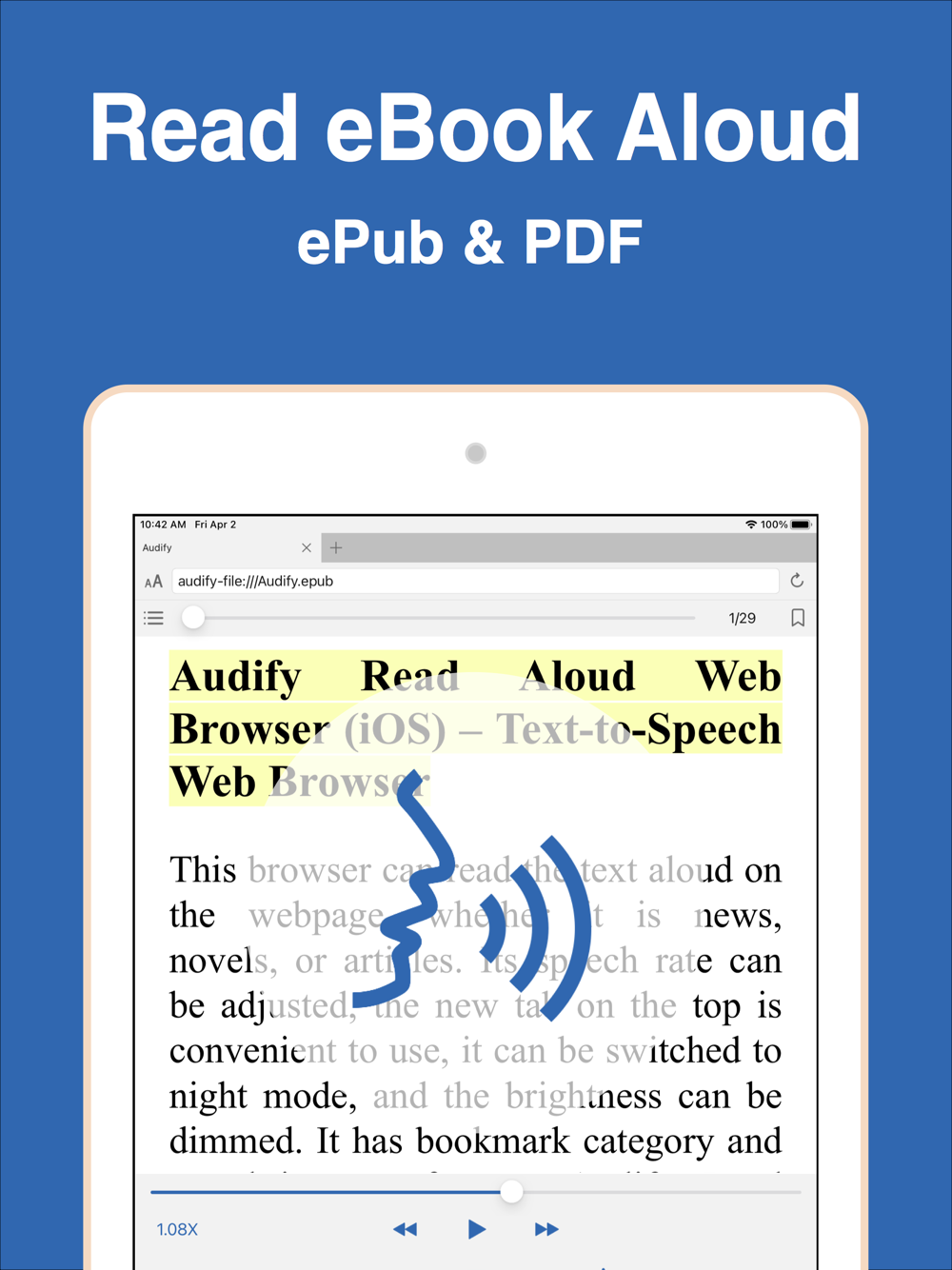 Audify is a text to speech app, web browser and PDF, ePub reader app. Audify can read aloud (TTS) web page text (HTML) and eBooks (ePub and PDF), whether it is news, novels, stories, or articles. Audify is designed to save your time and energy, and also protect your eyes. You can listen to the web page content while doing other things, such as commuting or doing exercises. You can learn more and get more knowledge. It can be switched to night mode, blue light filter mode, and the brightness can be dimmed. Font size can also be changed to become very large. It can translate languages, search in page, sleep timer (sleep story) and it has a couple of other useful features.