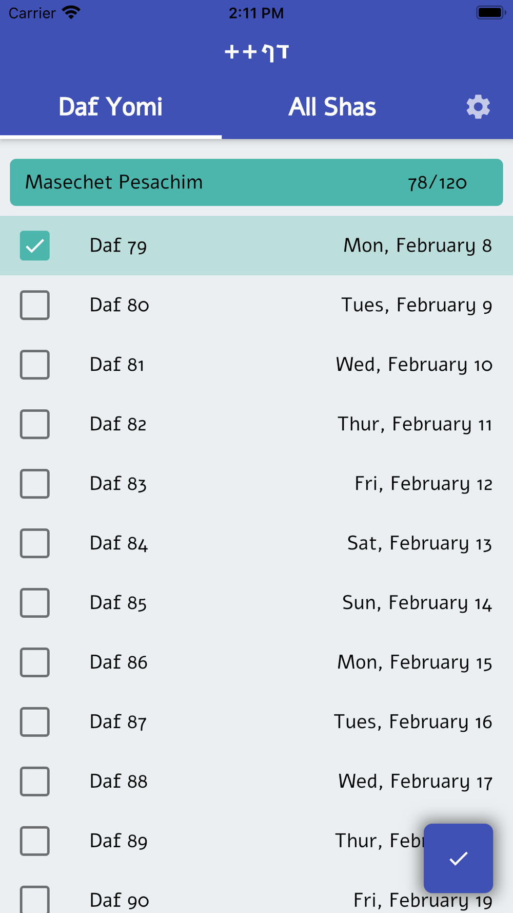 Keep track of the daily Daf Yomi as you learn through Shas!
