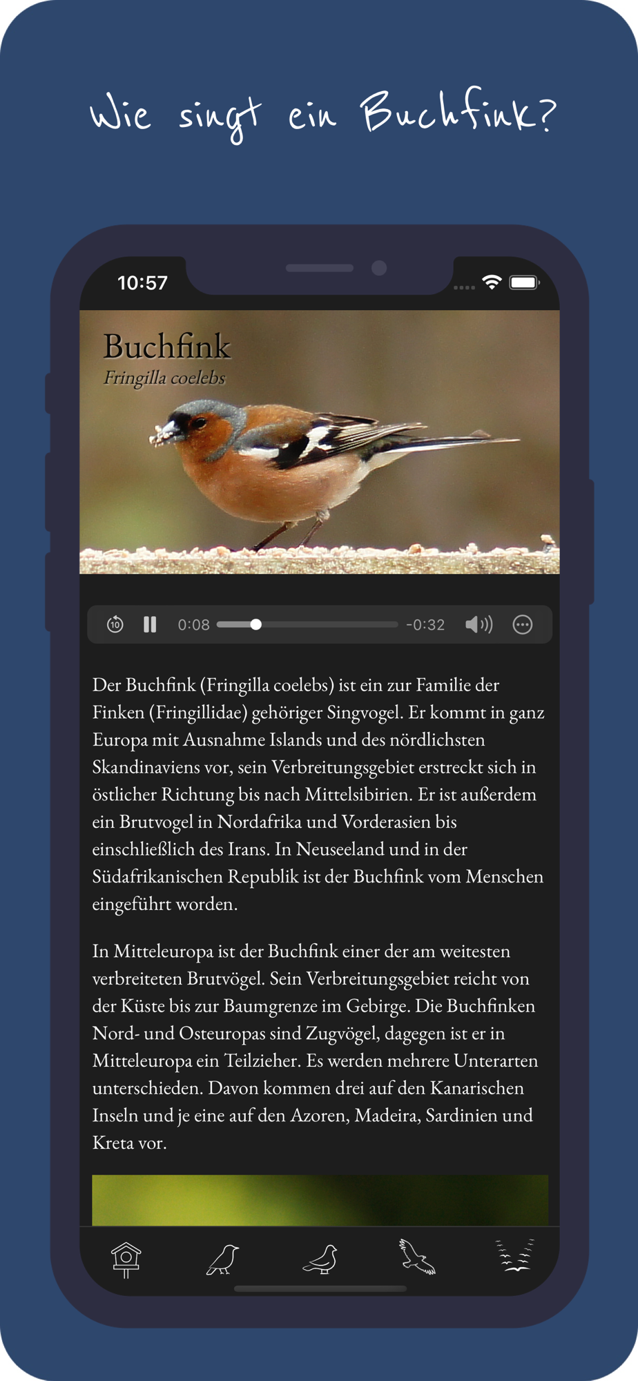 Jeder Vogel wird mit Text, Bild und Laut beschrieben. Alles damit Sie einfach sehen können welche Gäste Sie im Garten haben oder die Sie im Wald und auf Wiese begegnen. Alle Texte sind die wesentlichen Details aus der Wikipedia. Jeder Vogel hat auch einen Link zu dem Ursprungsartikel.