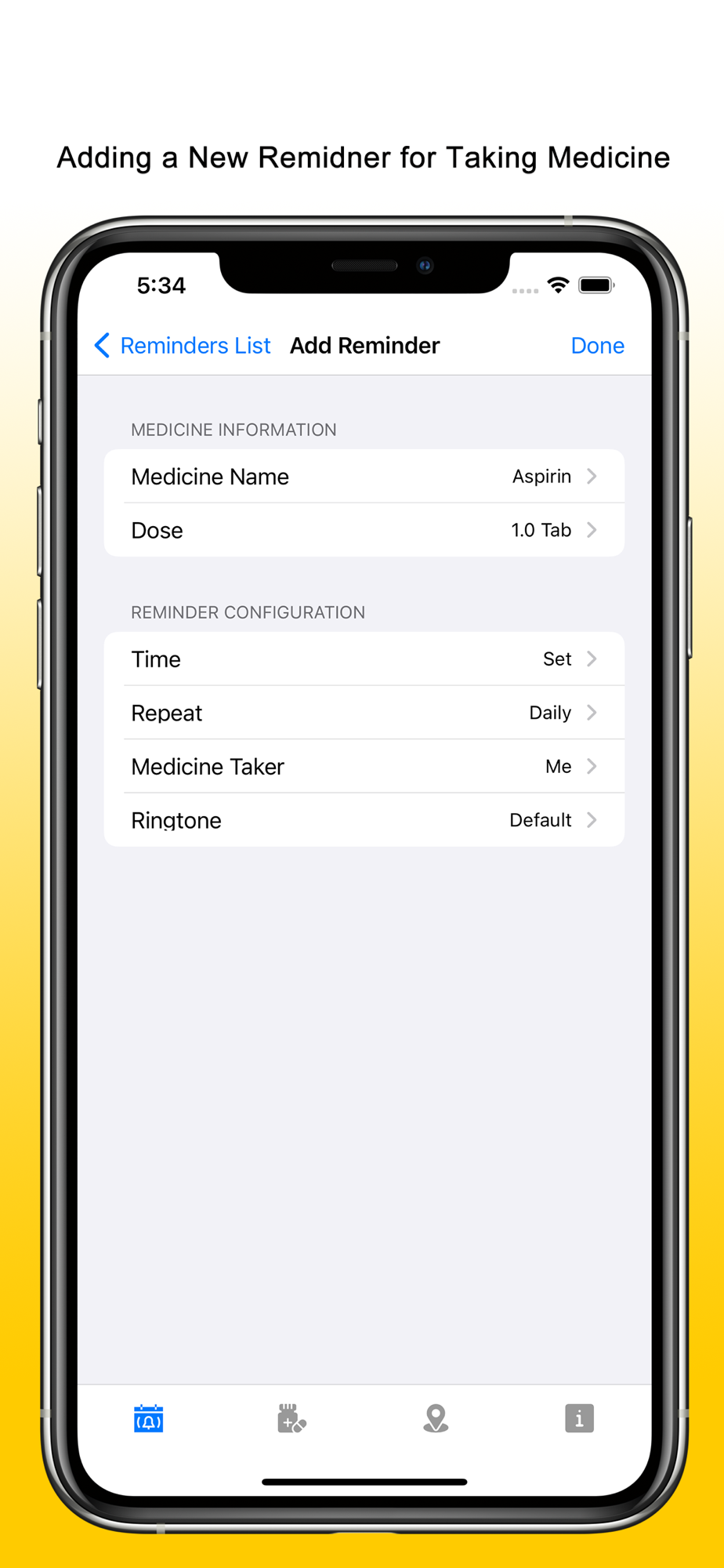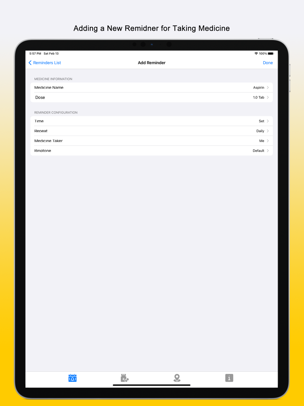 * Medication Reminder: you can provide one or more time for taking the medicine, the dosage, the person taking the medication and the interval for taking the medicine.