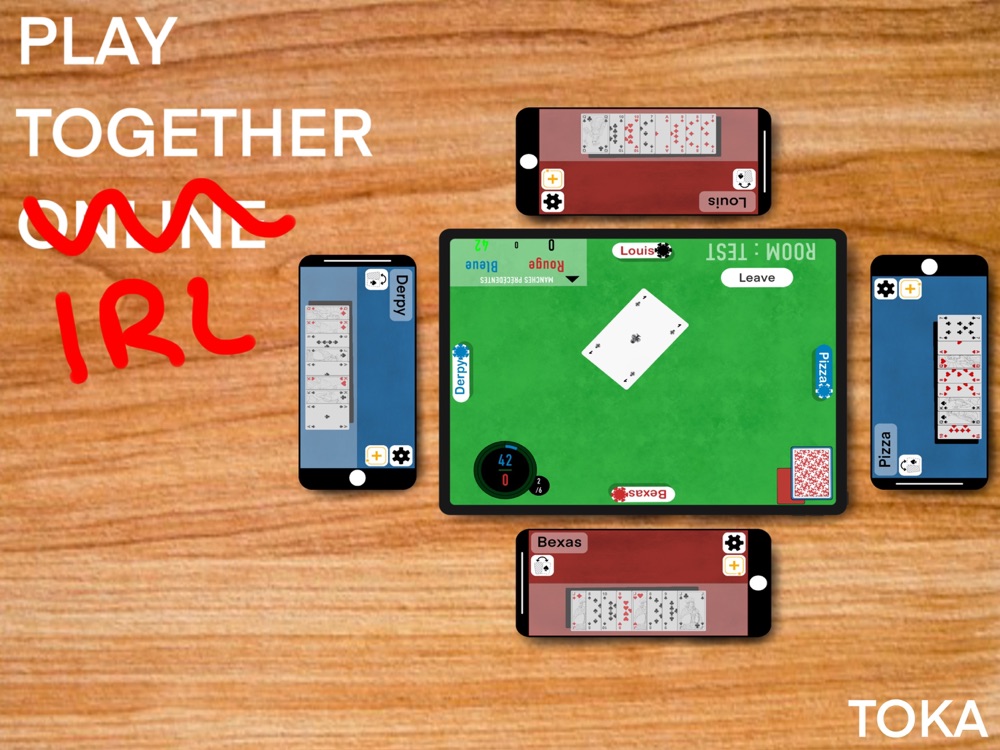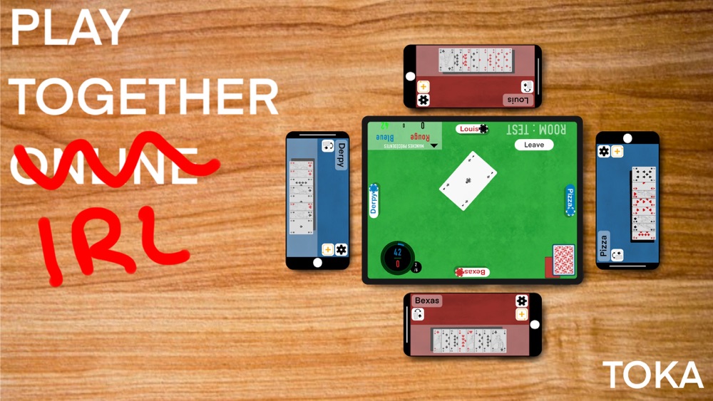 Toka vous permet de vous réunir autour d'un écran commun pour jouer a la belote, chaque joueur a ses cartes sur son téléphone et joue sur l’écran commun.