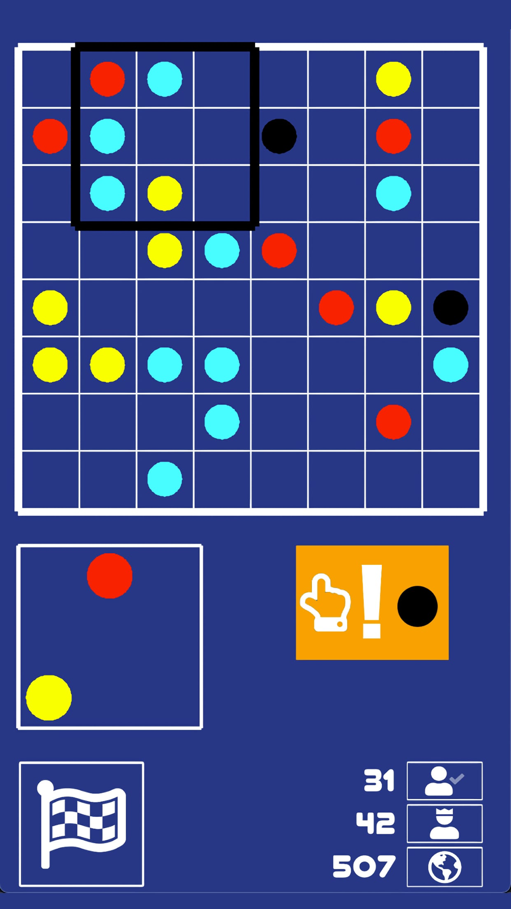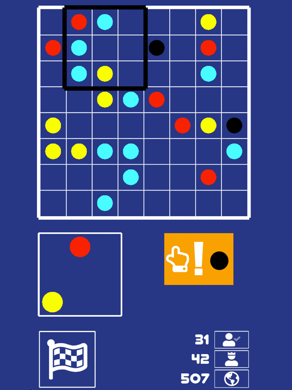 KREPZEN is a game designed by Néstor Romeral Andrés, from Nestorgames, and implemented by Garage Imagina. Place the 3×3 group of balls on the board, trying to match as many colours of existing balls as possible. For each matching colour you’ll get 5 points. For every ball placed on an empty space you’ll get 1 point. If you place a ball atop another ball of a different colour a black ball will be created, that you could remove by spending points.