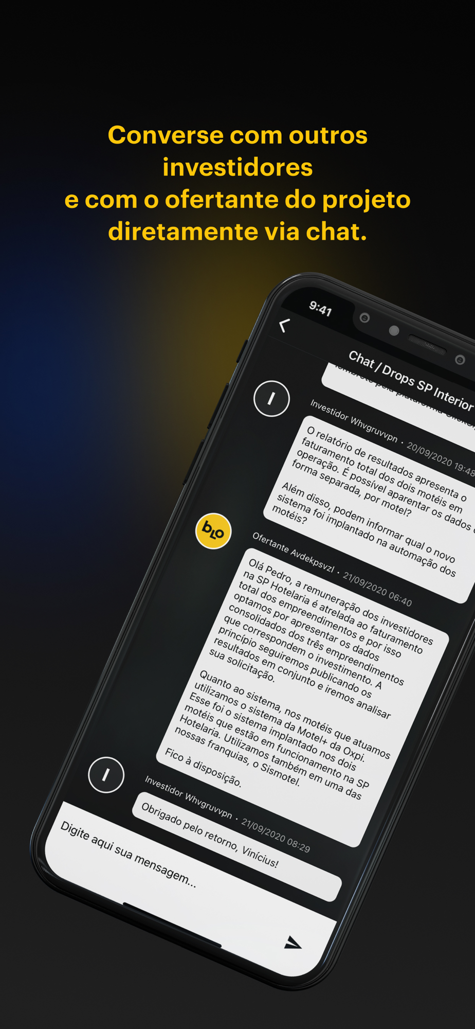 Converse com ofertantes e outros investidores através do chat, um canal dedicado a interação, sugestões e troca de experiências.