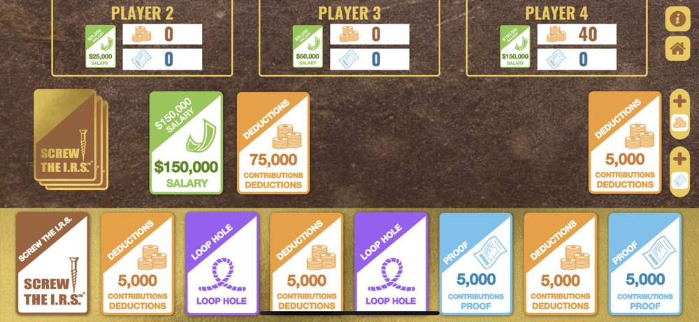 SCREW THE I.R.S. was designed for fun! The makers of this game do not advocate cheating on taxes or paying less than anyone’s share! Based on a smash hit physical card game from the late 80s SCREW THE IRS is finally available to you in digital form! This is a game of bluffing! Play DEDUCTION CARDS to equal your SALARY CARD so that you pay NO TAX! Beware! Other players will AUDIT you and you could lose everything! You also have the opportunity to AUDIT other players! Be the first to collected all necessary DEDUCTION CARDS and play a SCREW THE IRS card to win!