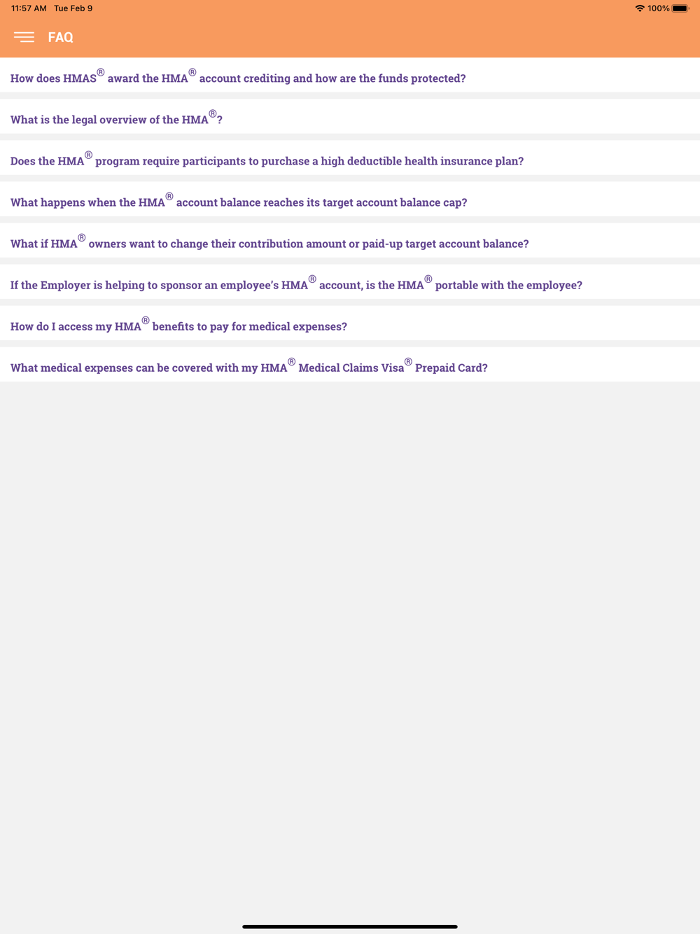 The HMA® Debit Card is swiped at the point of service to pay for the vast majority of our cardholders' 213(d) medical expenses up to our cardholders' HMA® account balance at the time of the service and can be used by either individuals or families. There is also a mail in reimbursement option for medical expenses that cannot be paid with the HMA® Debit Card.The HMA® Debit Card program also comes included with unlimited telemedicine services.