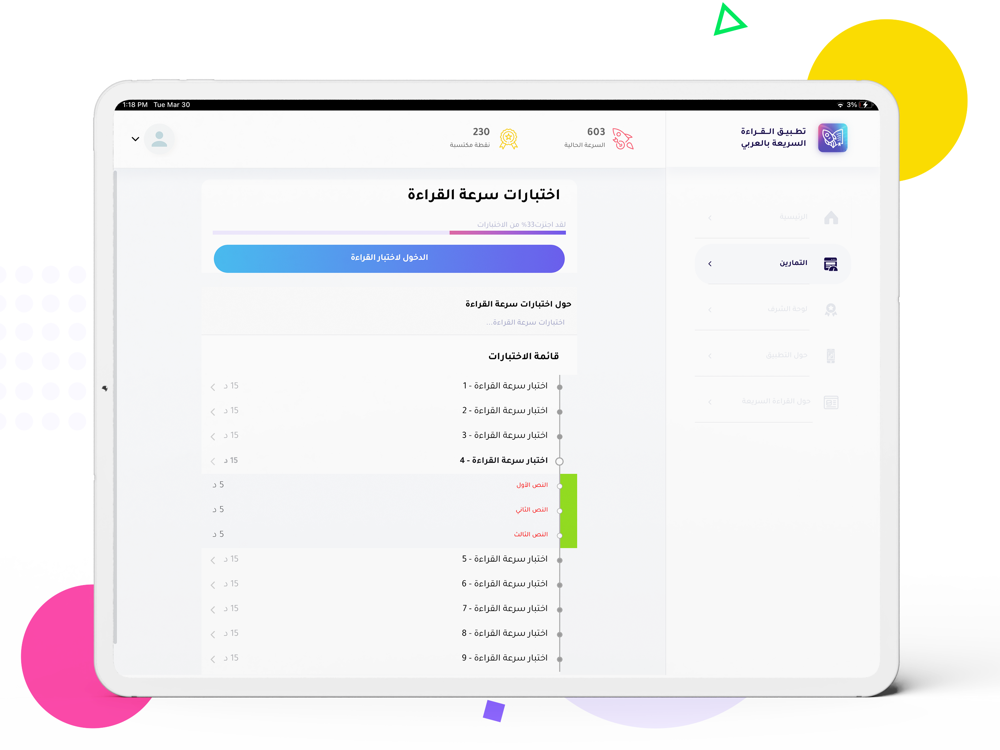 كما يحوي التطبيق دورة منهجية تمكّن القارئ من زيادة سرعة قراءته في 30 يوماً، عبر المتابعة اليومية لمجموعة من التدريبات والتمارين.