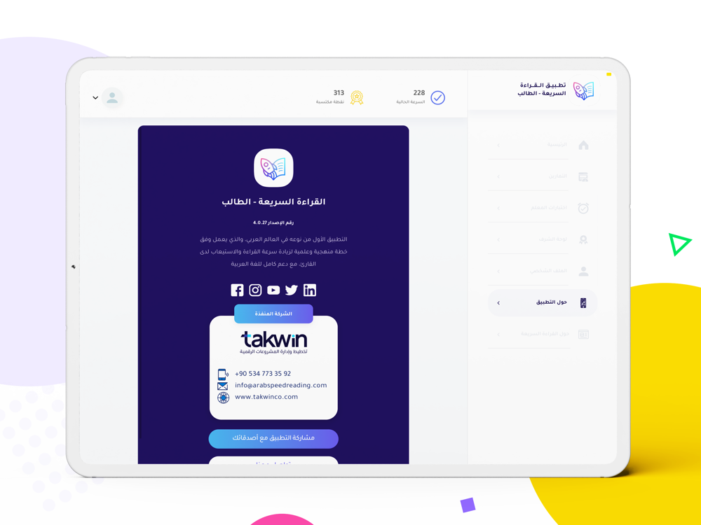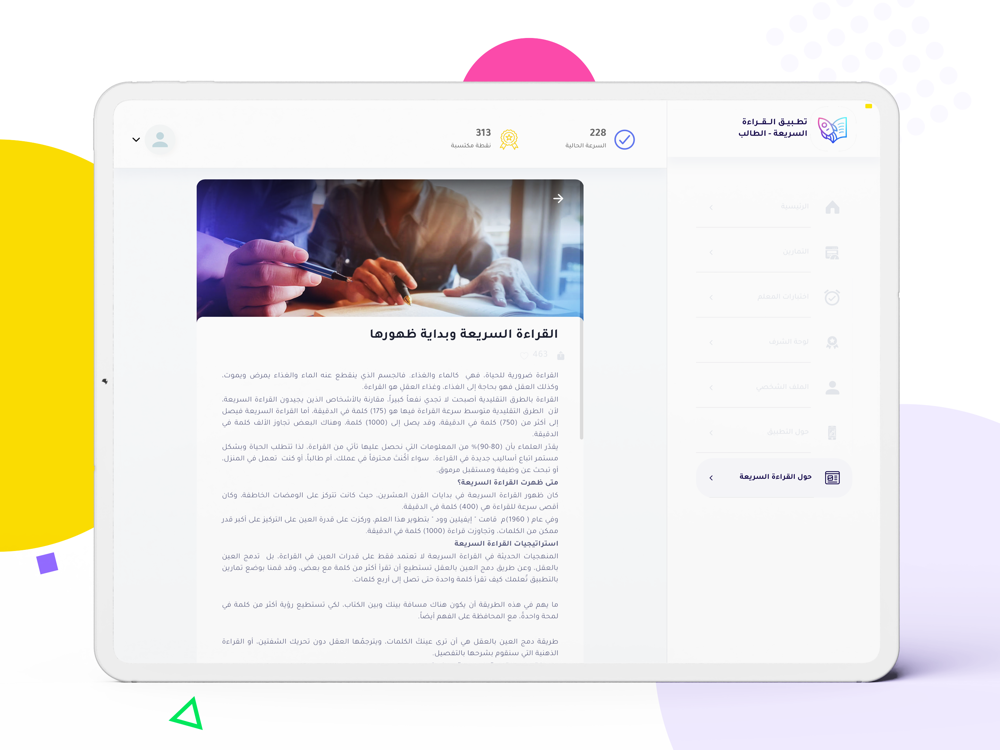 القراءة السريعة هو تطبيق فريد يساعد القارئ العربي على تعلم مهارات القراءة السريعة عبر تحسين سرعة القراءة مع المحافظة على الاستيعاب.