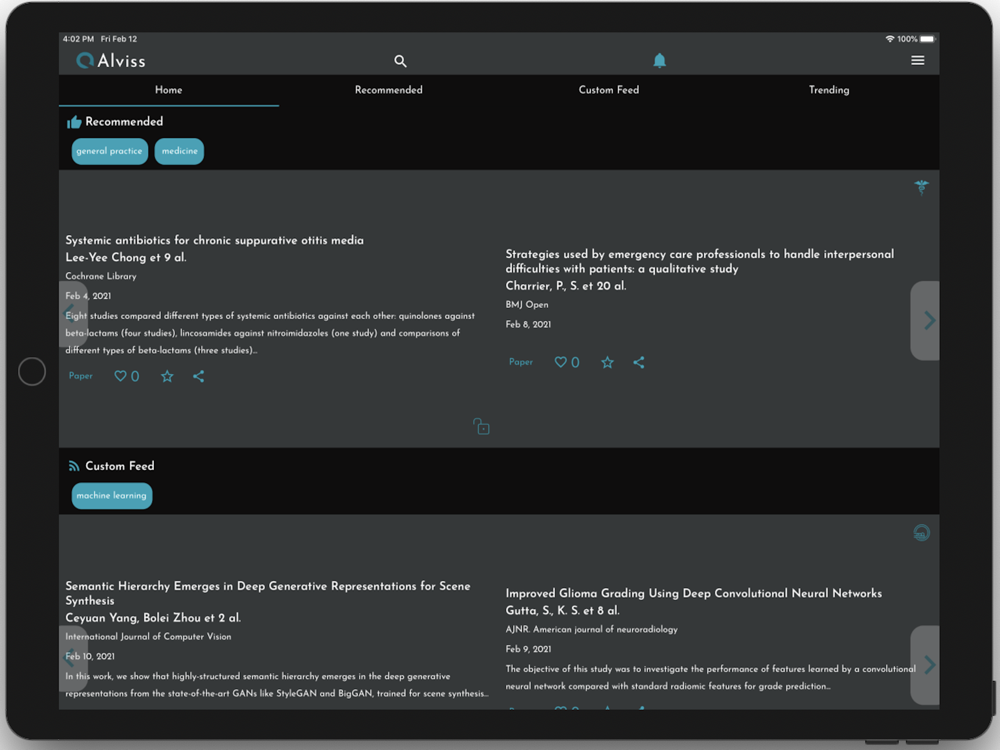 The App displays recently published scientific publications in an easily customizable fashion. Alviss covers many disciplines including medicine, biology, economics, computer science, astronomy, engineering and many more.