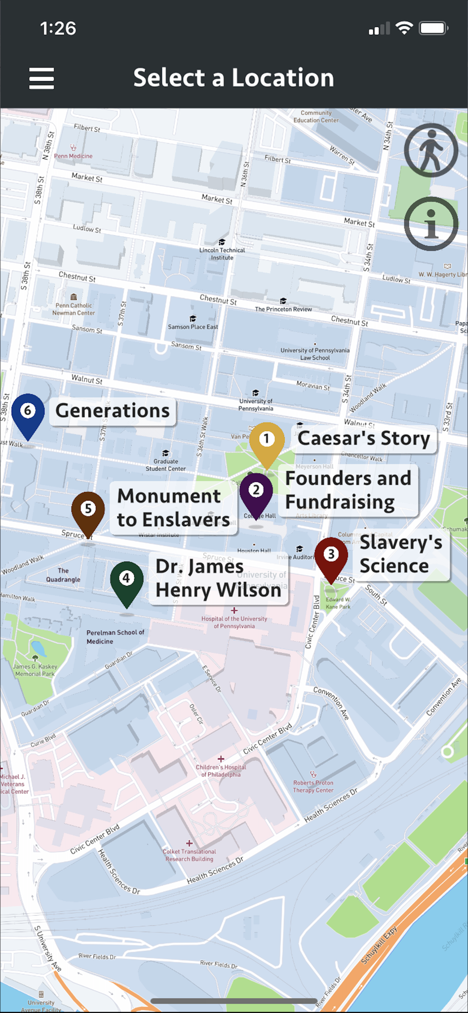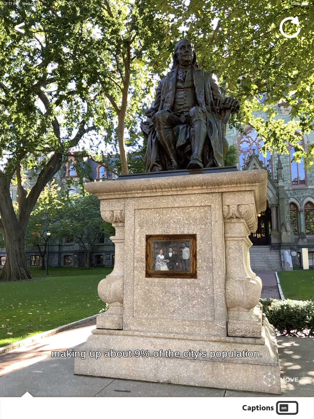This app takes users on a tour of slavery's legacy at the University of Pennsylvania in six stops, each telling a story through an augmented reality (AR) experience. The tour relates to specific locations on Penn's University City Campus, but if you are not on campus, you can still access all the content and experiences.