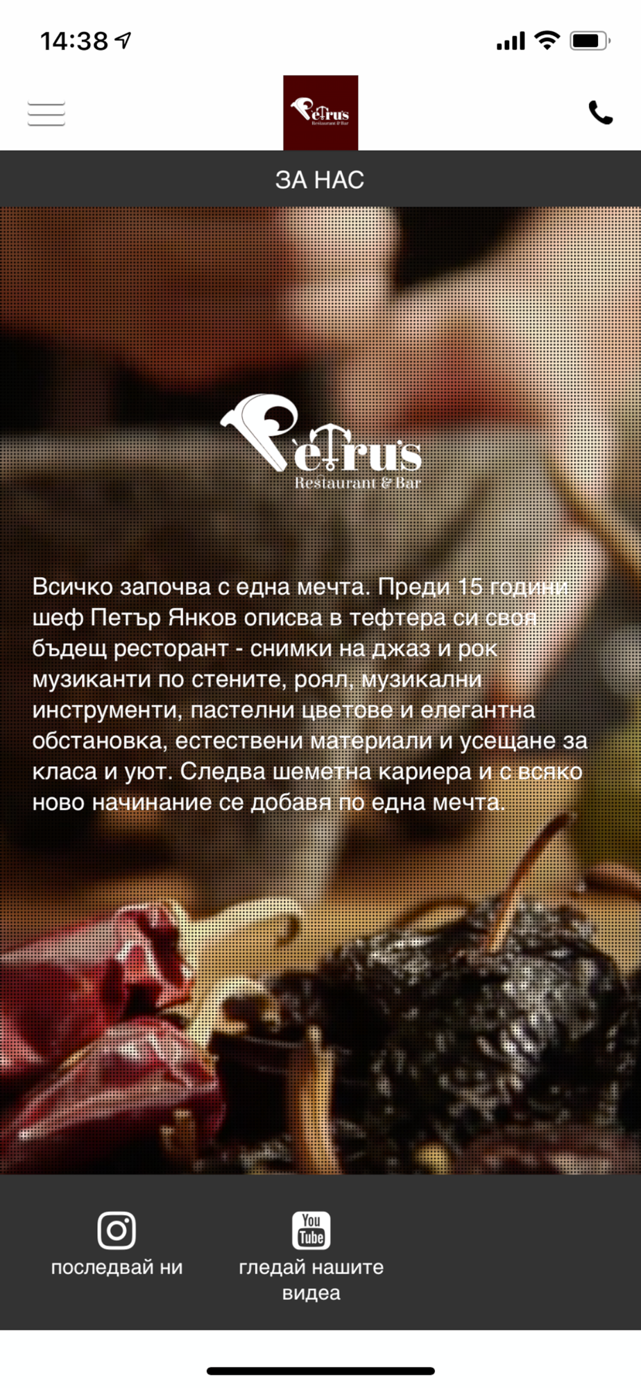 Трудно можем да се сетим за по-подходяща идея от тази талантлив и перспективен готвач да отвори собствен ресторант. И то не просто място, където да хапнеш, а просторно заведение с отделни концептуални зали за една чудесна кулинарна еклектика. Преди десетина години на Петър Янков, тогава главен готвач на луксозен ресторант в Пловдив, му хрумва идеята да направи собствено заведение, където да остави въображението и кулинарния си талант да се вихрят свободно. Да предлага на гостите неговата представа за добра кухня. Отваря един празен тефтер и записва името на бъдещото си място - Petrus. Хубавите и изпипани начинания се случват бавно и с обмисляне. В продължение на години Петър развива уменията си, като трупа опит и знания от обучения и практики в чужбина, а записките в тефтера набъбват с идеи и впечатления. И така допреди година-две, когато решава, че моментът е назрял и започва да се оглежда за място. Случайно попада на сградата на бул. Свети Наум 48 и я познава веднага. С двата си етажа, широкия паркинг, детския кът, терасите и простора си, тя му позволява да даде пълен размах на мечтите си. На първия етаж те посреща закрита градина, от която любезнаият персонал те кани любезно да разгледаш залите и да избереш местенце по твой вкус. Вляво от входа е просторната музикална зала. Дискретно монтираните лампи осветяват едновременно меко и обилно помещение с удобни дървени маси и столове. В дъното са подредени електронно пиано, китара и микрофони, чакащи петъчните и съботните вечери. Самият собственик идва от музикално семейство и е запален меломан, затова озвучаването е важен елемент в Petru's. По стените пък са окачени рамкирани портрети на големите в рока и блуса, като в унисон са и песните, които звучат от колоните. Качвайки се на втория етаж, попадаш в минималистично и стилно подредената суши зала. Да, суши можеш да поръчаш навсякъде в Petru's, но тук е мястото да му се насладиш в подходящо обкръжение. Тоновете са меки и обрани, а големият аквариум допринася за спокойствието на гостите. В съседство се намира VIP залата с една единствена маса, обкръжена от 12 тежки стола. Мястото е идеално за бизнес вечеря или за важни по делови или лични въпроси на спокойствие, откъснати от останалите клиенти и персонала. Пак на втория етаж е и show-cooking стаята. Готвачът стои зад голяма стъклена рамка и приготвя храната пред очите на гостите. За тях, в това крило на Petru's, има и шоу-колички, на които имат възможност и сами да приготвят предпочитаното ястие. Звучи като чудесна идея да въртиш телешките пържоли върху базалтови камъни, които се нагорещяват 400 градуса, а после с компанията да обсъждате достойнствата на собствените ти умения. Разбира се, можеш да разчиташ на екип от отлични готвачи, които ще сготвят твоя избор от менюто. Самото то включва обикновени продукти, но приготвени по необикновен начин. Представи си телешки език, направен не по традиционна рецепта, ами поднесен с панчета от Италия, препечен хрупкав пармезан и няколко вида салата. Звучи страхотно, нали? Продуктите се доставят от малки ферми, залагащи на качество и екологична чистота, а правилото, че изисканата и питателна кухня е скъпа, тук е напълно забравено. При виното отново имаш внимателна селекция от 130 етикета, като половината от тях идват от малки и независими български изби. Предлагат и заглавия от Стария 