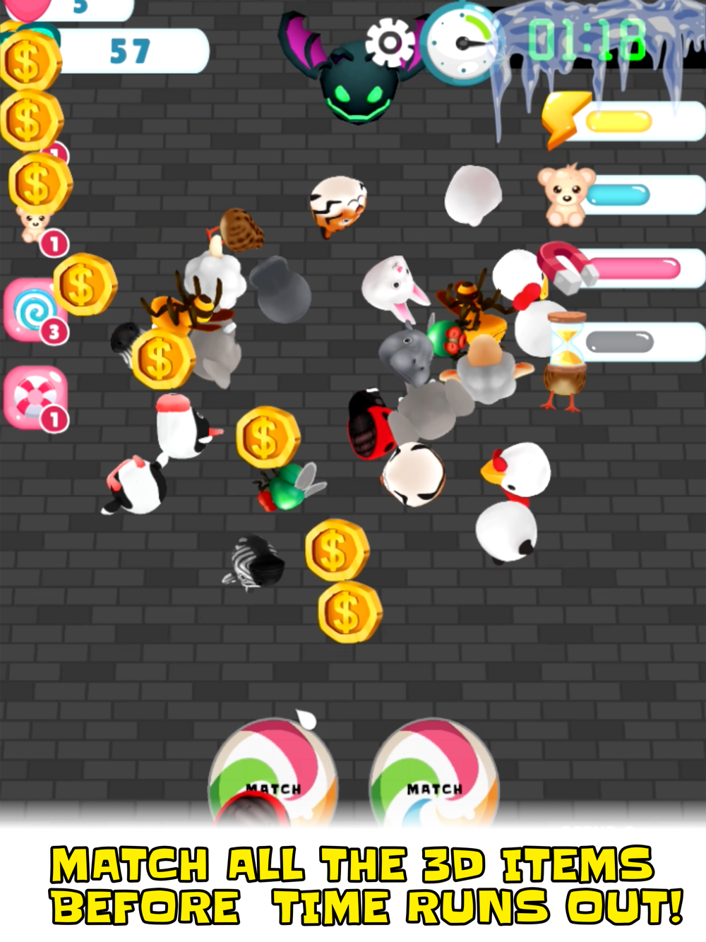 Many cute and fun items, such as adorable animals, funky fruit and crazy cars. Match each pair of 3D objects before the time runs out to win the round. After each round you can buy power ups and enable special skills to help you win the next level.