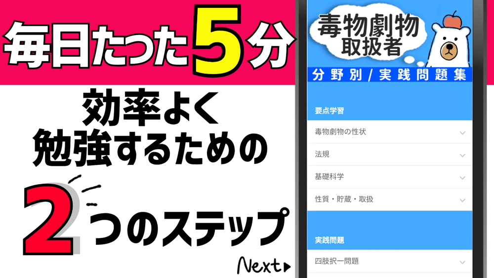 毒物劇物取扱者の過去問対策、分野別問題アプリです!
