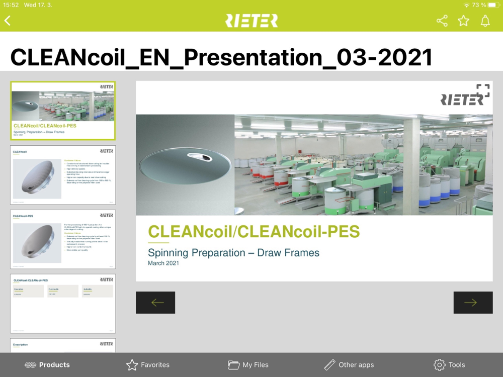 The Rieter Sales App enables employees and agents to professionally showcase the group-wide portfolio. By logging in with the respective credentials, users are provided with up-to-date and comprehensive information about products, services and events.