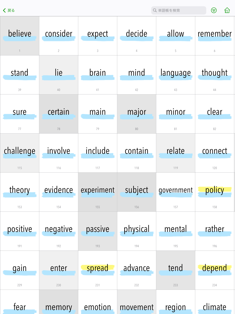 ・単語を確認する毎にタイルが黒くなっていく「使い込み度」表示