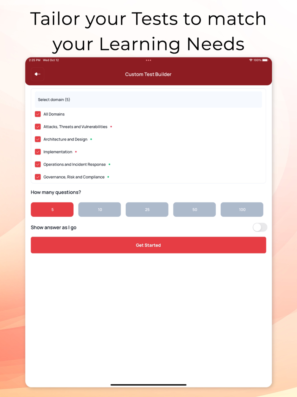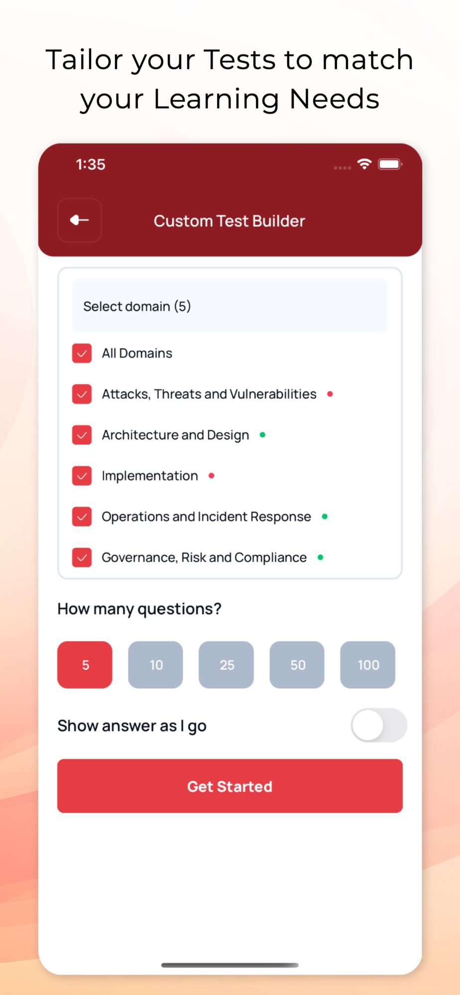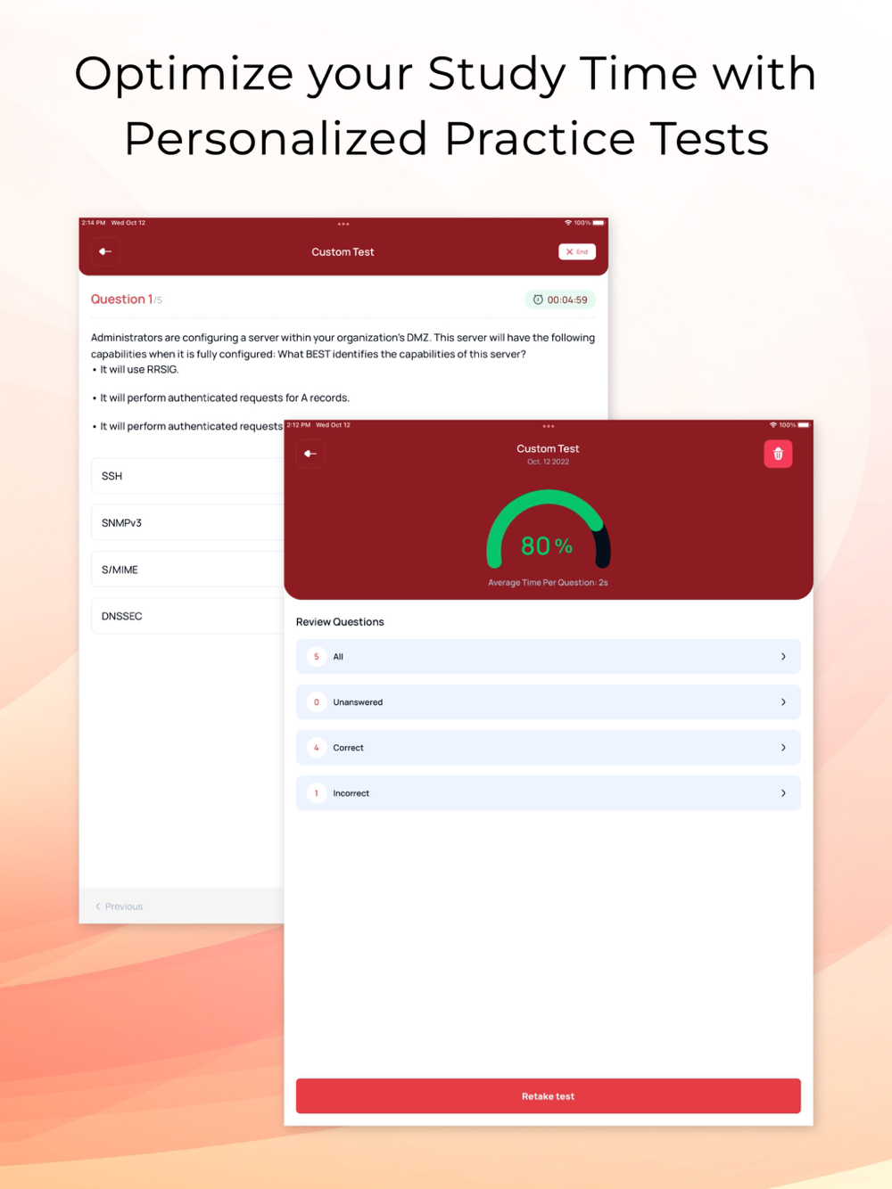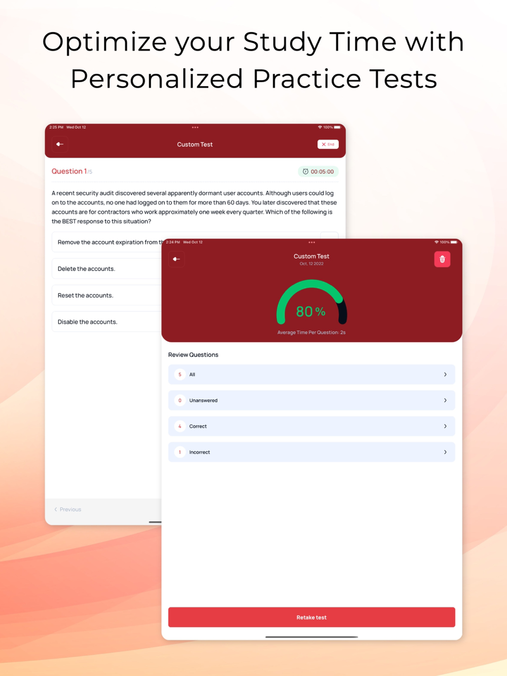 Personalize your practice with our custom test builder feature. Select specific topics and questions to create tests tailored to your needs for the Security+ Exam. The test engine generates personalized tests with a mix of new and your weakest questions, helping you focus on the areas where you need the most improvement.