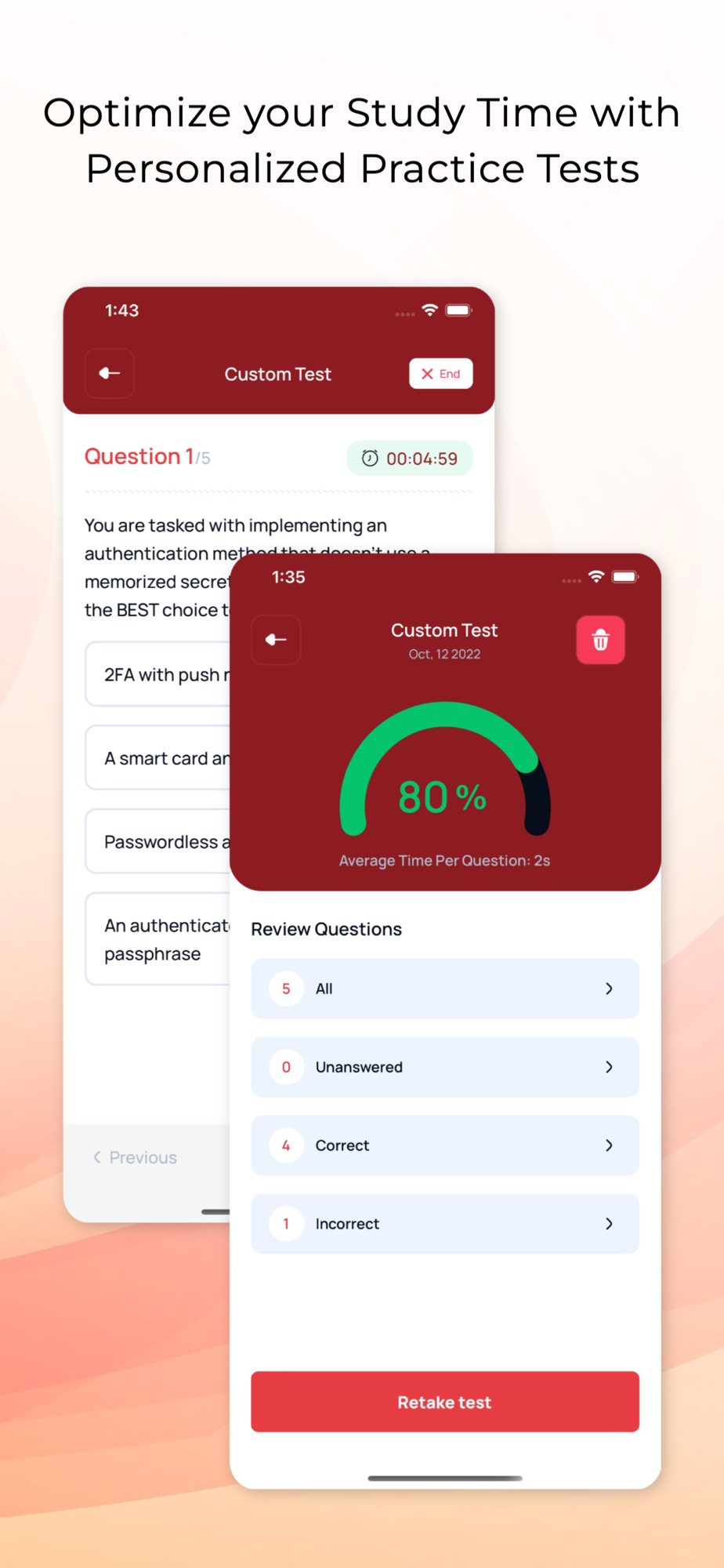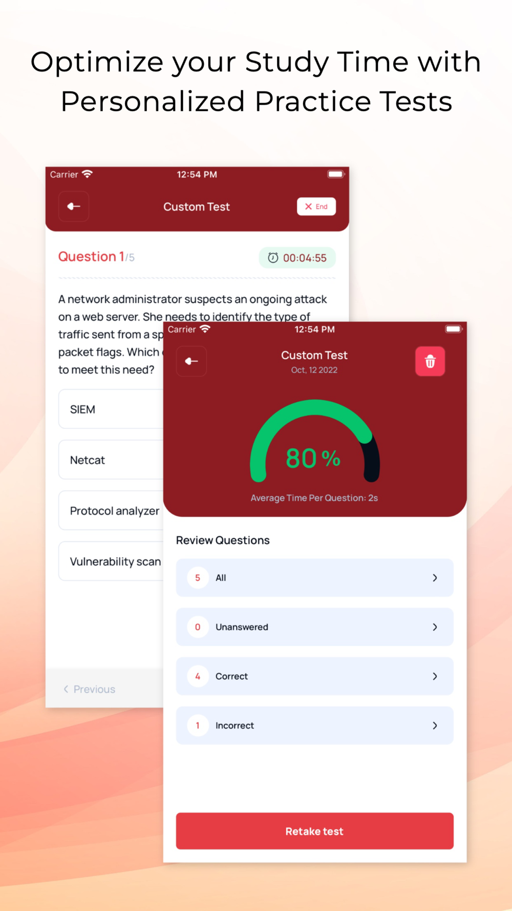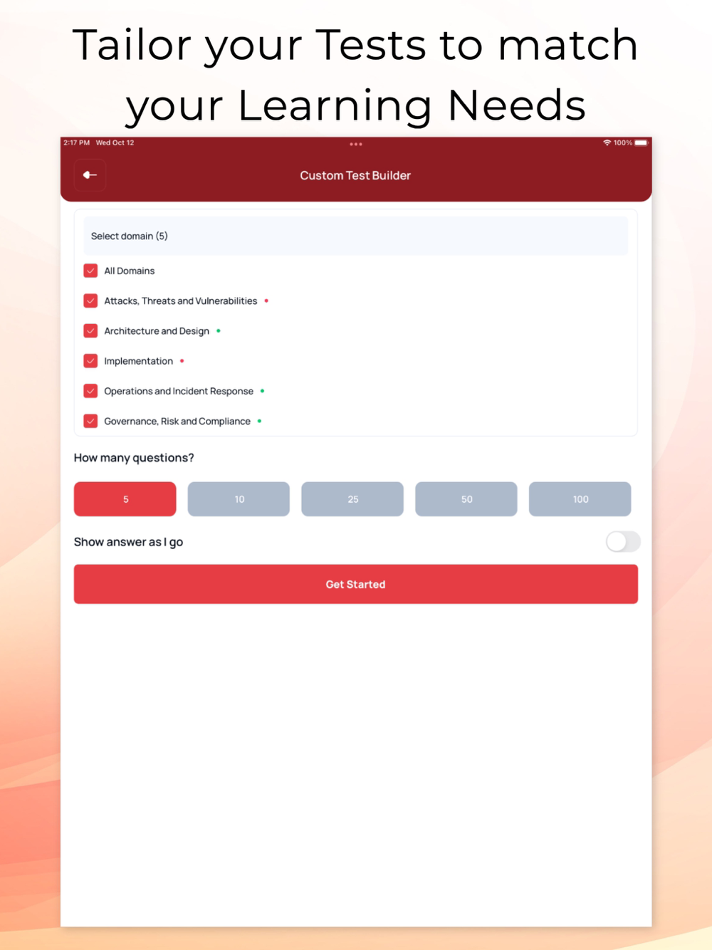 Personalize your practice with our custom test builder feature. Select specific topics and questions to create tests tailored to your needs for the Security+ Exam. The test engine generates personalized tests with a mix of new and your weakest questions, helping you focus on the areas where you need the most improvement.